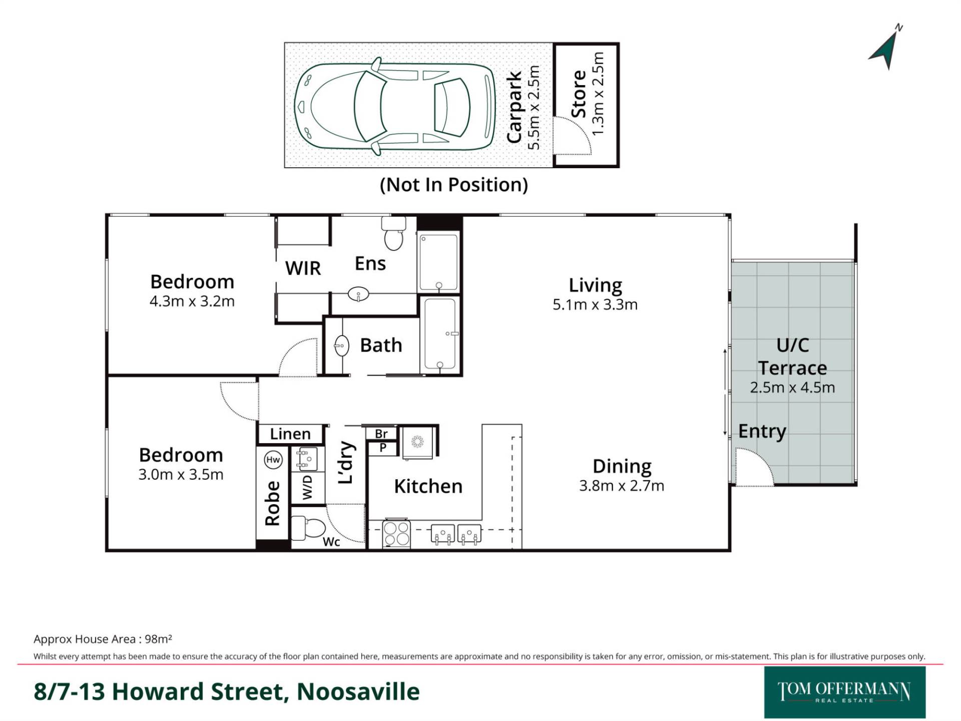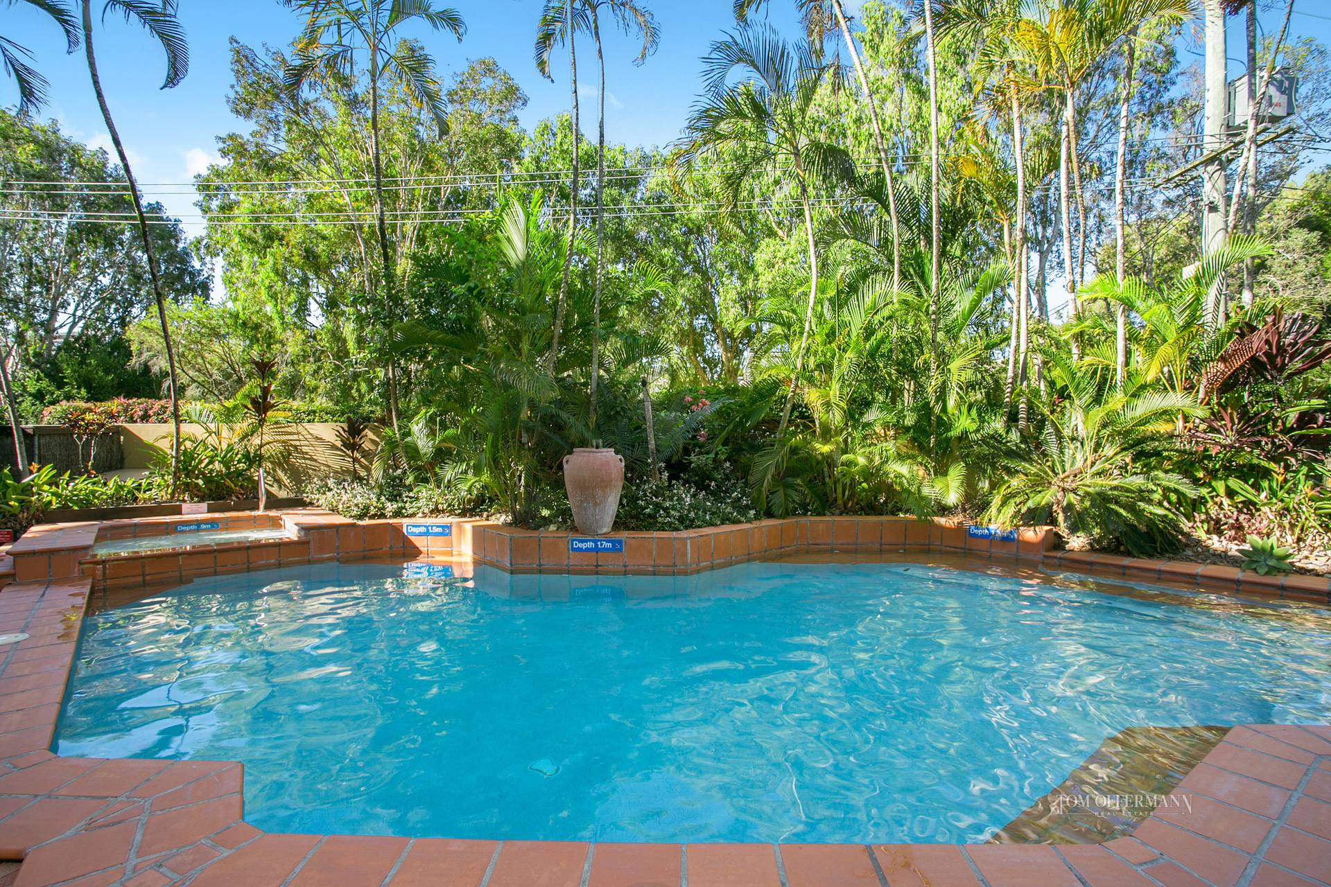 - Terrace: NE facing to Noosa River; surrounded by palms; terracotta-tiled 2.5m x 4.5m undercover w Weber BBQ