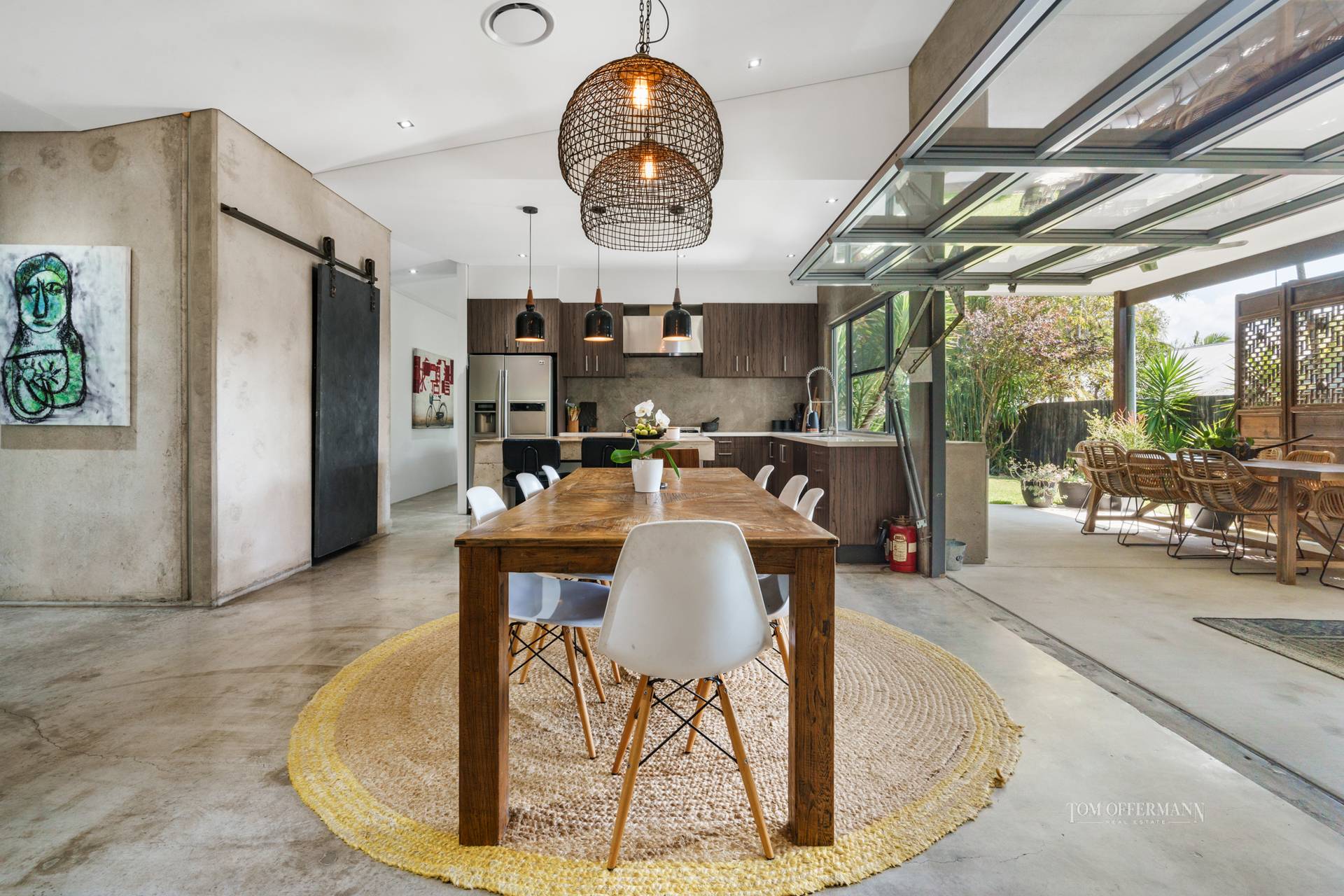 Indoors open plan living, and dining areas radiate timeless integrity, flair, scale, functionality, and coalesce seamlessly with the expansive terrace with its lush verdant backdrop, thanks to an uncomplicated twist. A custom easy lift powder coated aluminium & glass garage door rises to every occasion, whatever the reason and season.