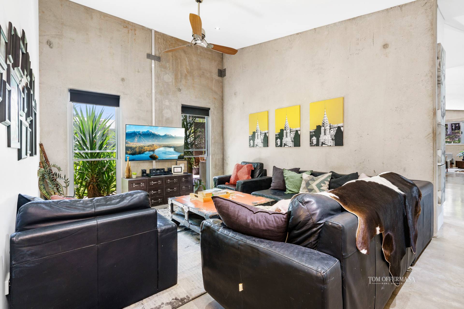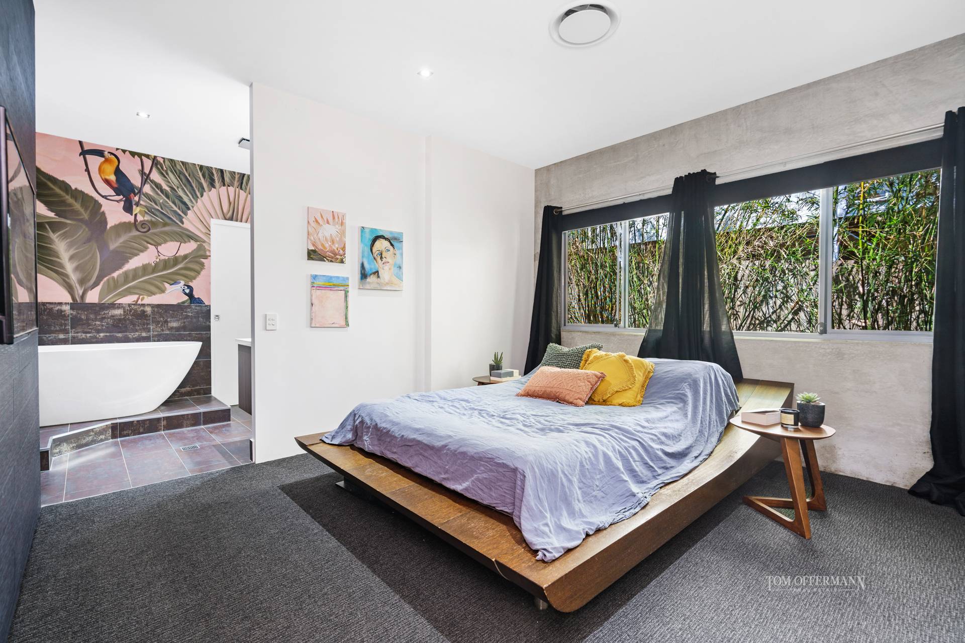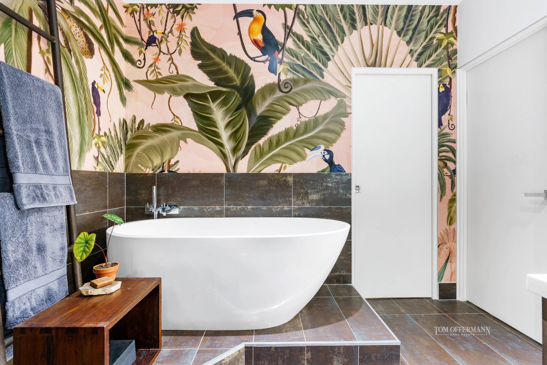 • About: preformed/polished concrete throughout; mid-century modern/eclectic; low maintenance; high ceilings; easy lift powder coated aluminium & glass garage-width door to undercover alfresco; BBQ; alfresco/living, hang out space with peacock wallpaper; bedrooms carpeted; main walk-in robe ensuite with toucan wallpaper, oval bath, stone tops, burnished copper toned tiles; access office also from front; 2 bedrooms with walk-in robe & share bathroom; 2 bedrooms access 2-way walk-in robe & share bathroom