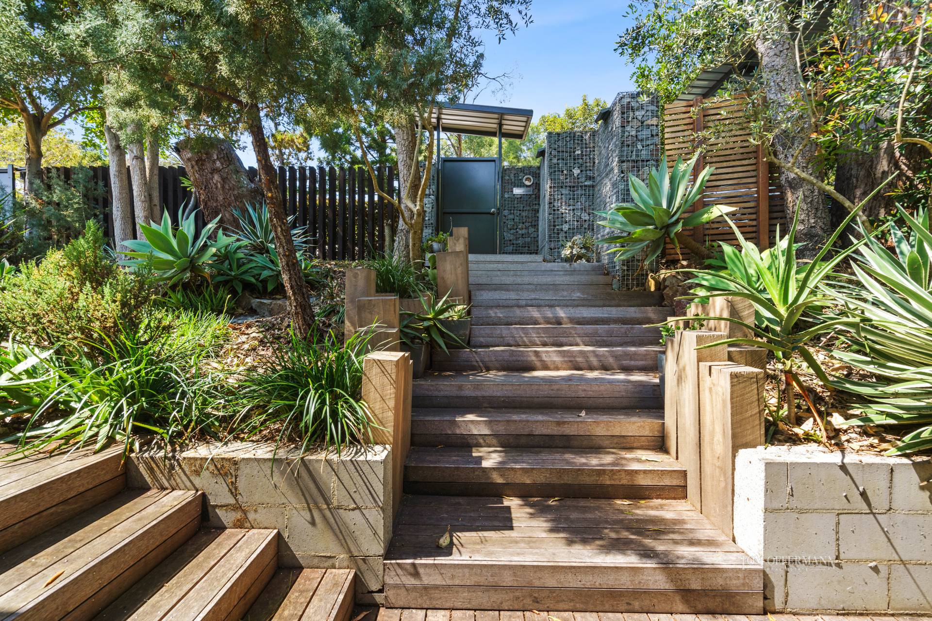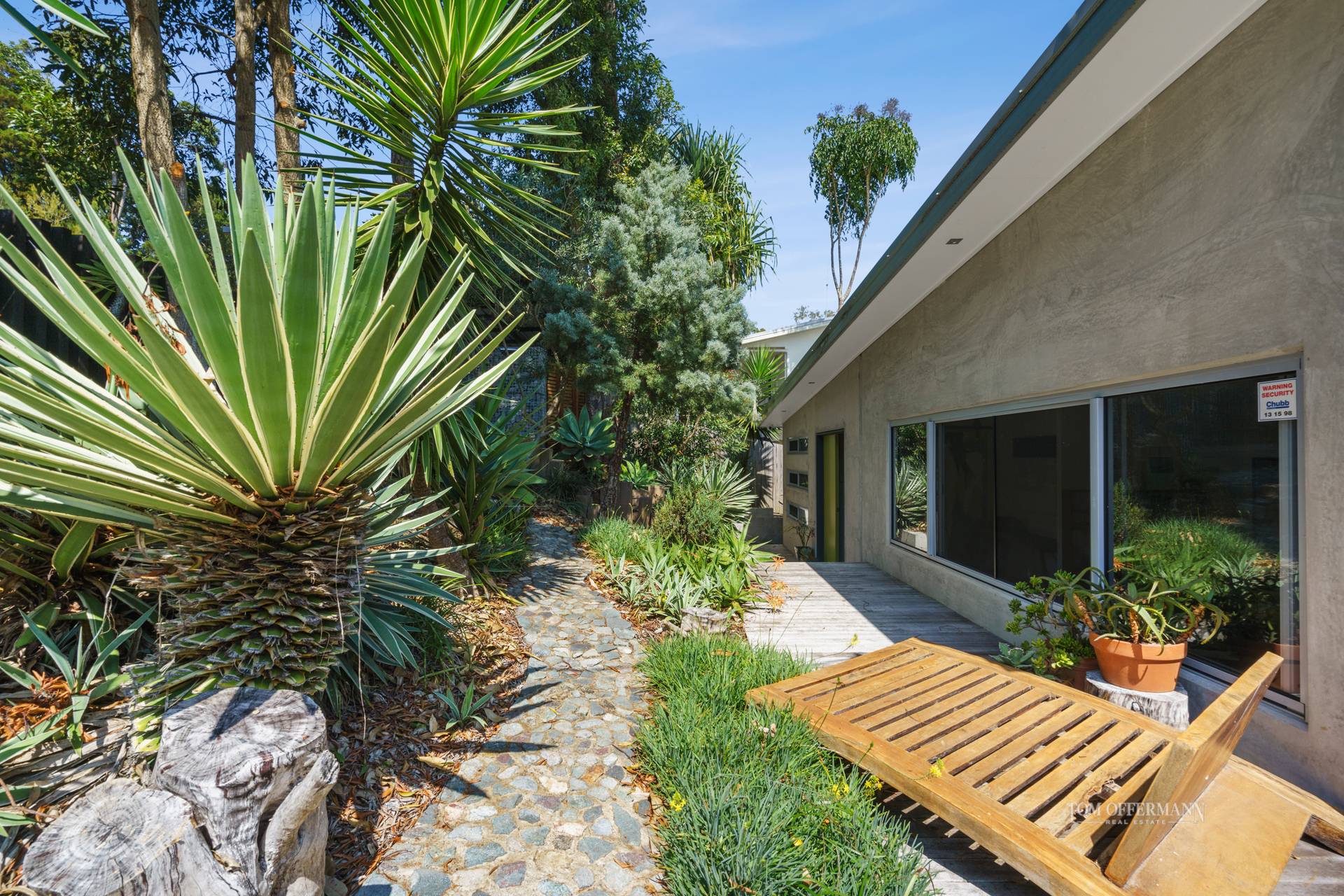 Along the timber walkway past olive and lime trees, open the front door almost expecting an artist-in residence. There's a unique sense of young at heart playfulness, pops of brilliant colour especially wallpaper, and all shrieking mid-century modern, yet juxtaposed by the natural shimmering textures and clever use of endless polished concrete.