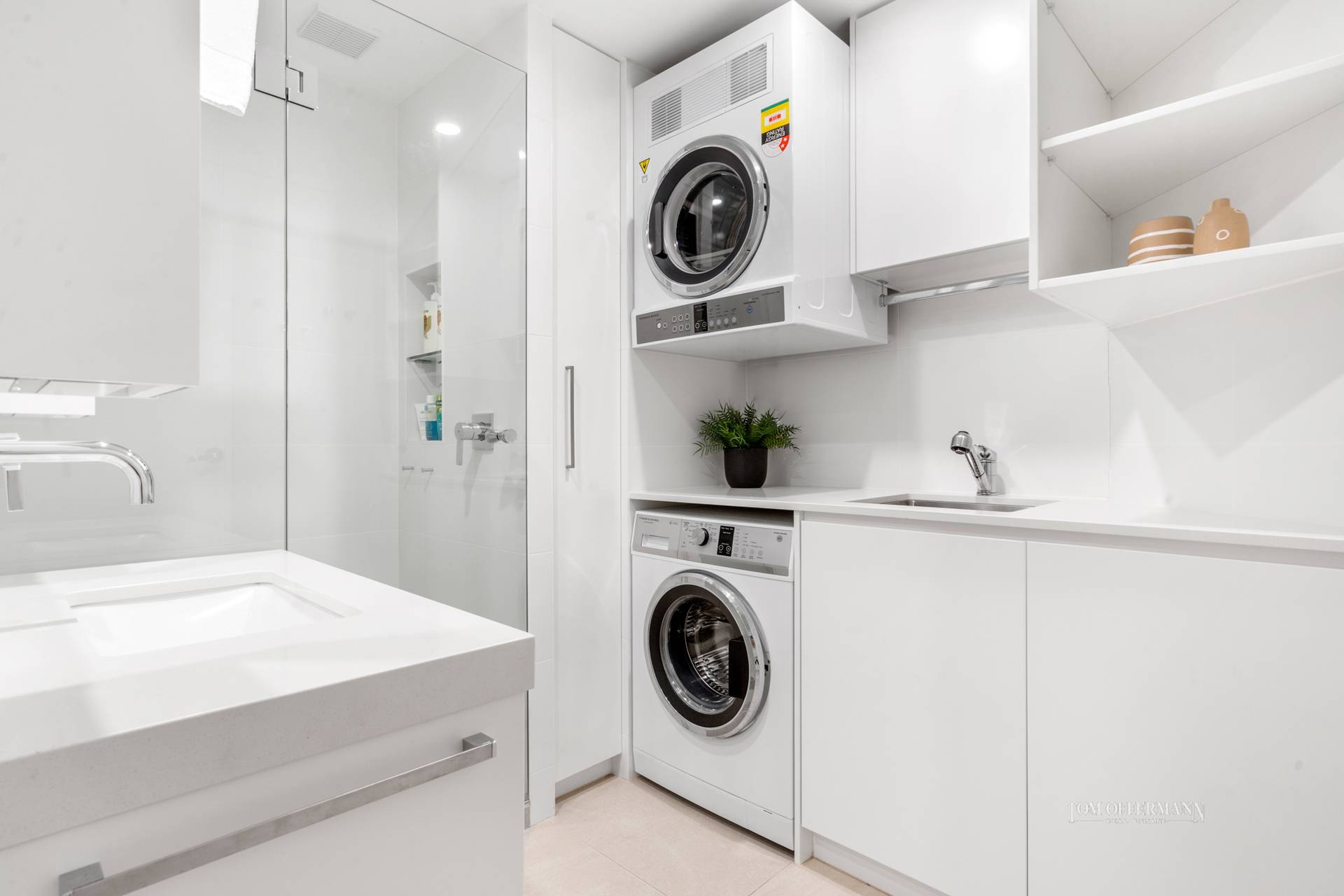 The twin/queen bedrooms have a blue and white palette. Features mimic the master. Ditto the bathroom which also doubles as a laundry.
