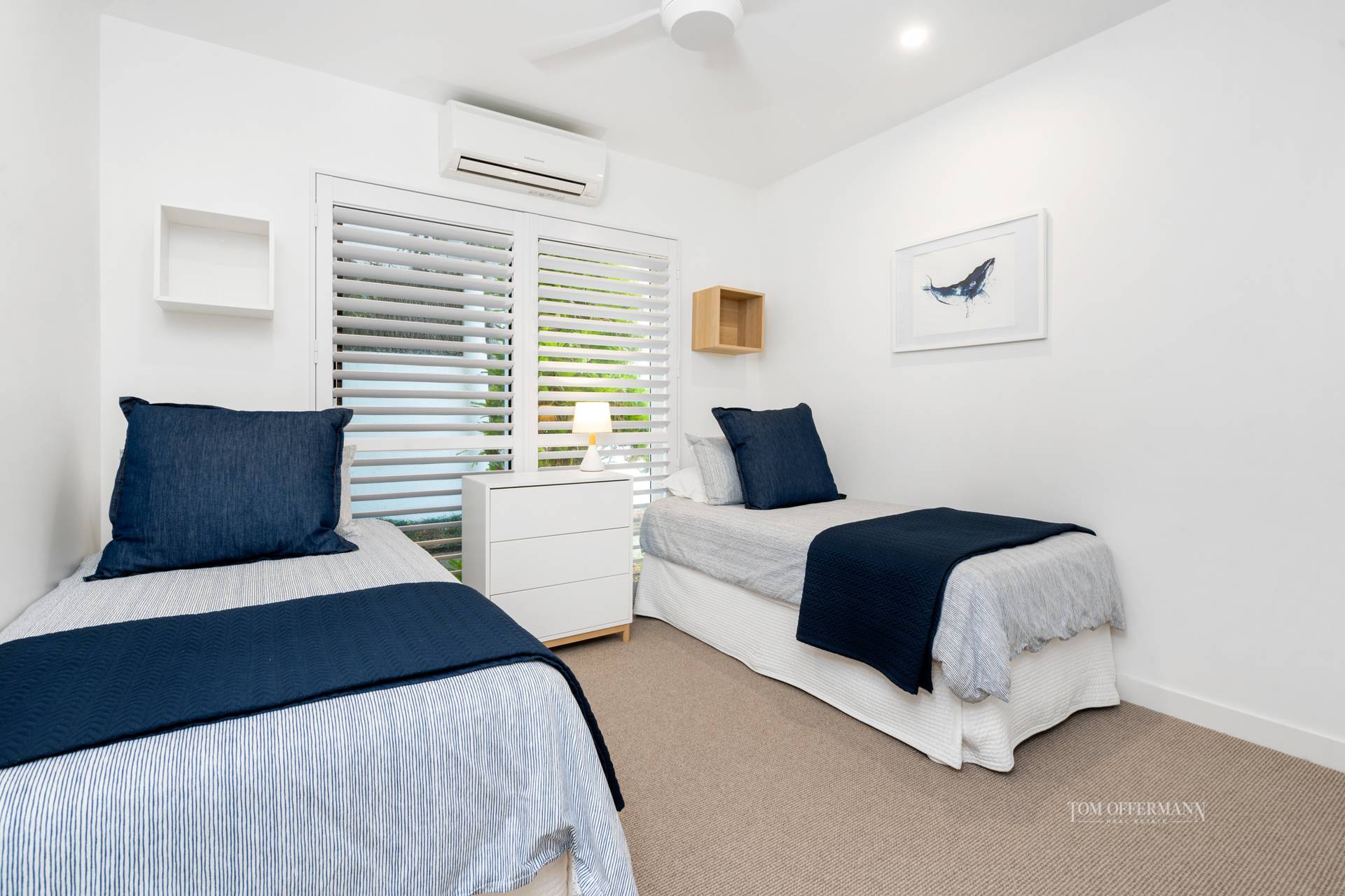 The three bedrooms have plush carpets, plantation shutters, customised tall robes and deep drawers, luxury linen and accessories. The king master suite has access to undercover terrace and steps to the pool, sheers and blackout window treatments, aqua and white palette, television, plus ensuite bathroom with glass door entry, white stone-topped vanity, mirror-fronted cabinetry, shower and extra storage.
