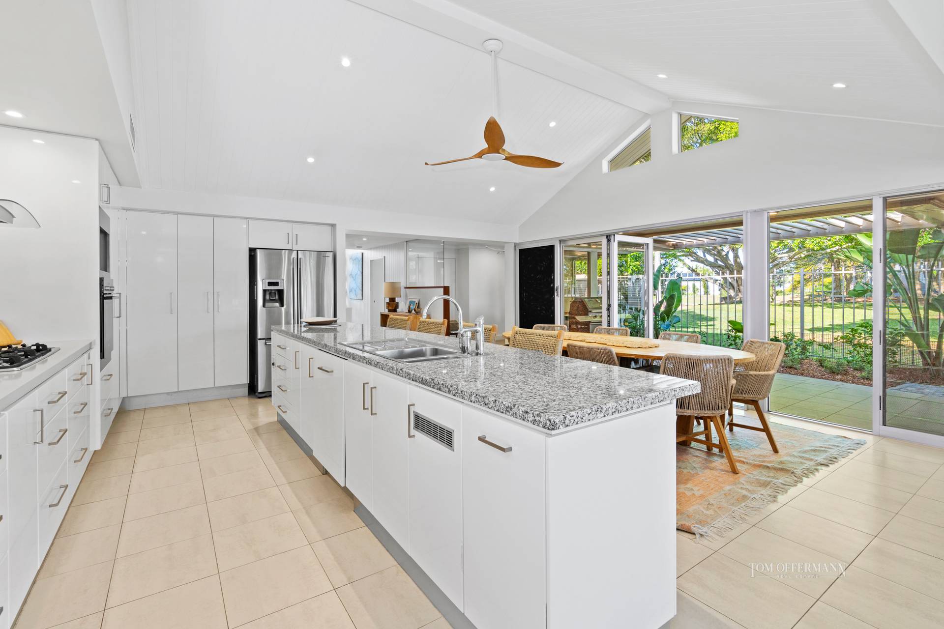 Look along the hallway and beyond. Admire banks of glass louvres throughout acting as efficient breezeways and multiple bi-fold doors off the dining space opening to an undercover terrace thanks to an auto Vergola system. In addition, when the privacy fence is retracted there are views of Seahorse Park, plus a gate in the wrought fence, handy for kids wanting the check out the Ficus trees with giant roots and branches almost draping the ground.