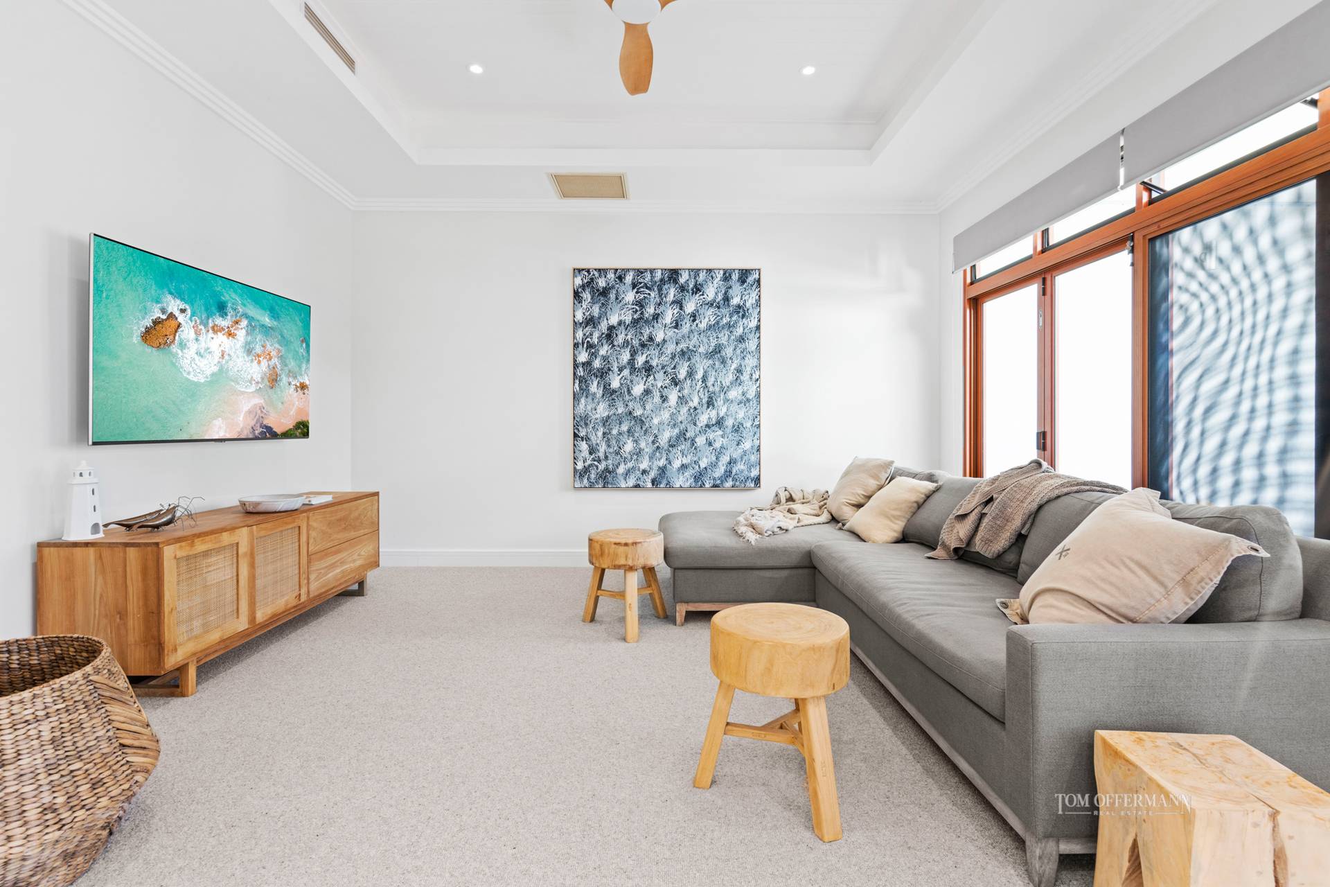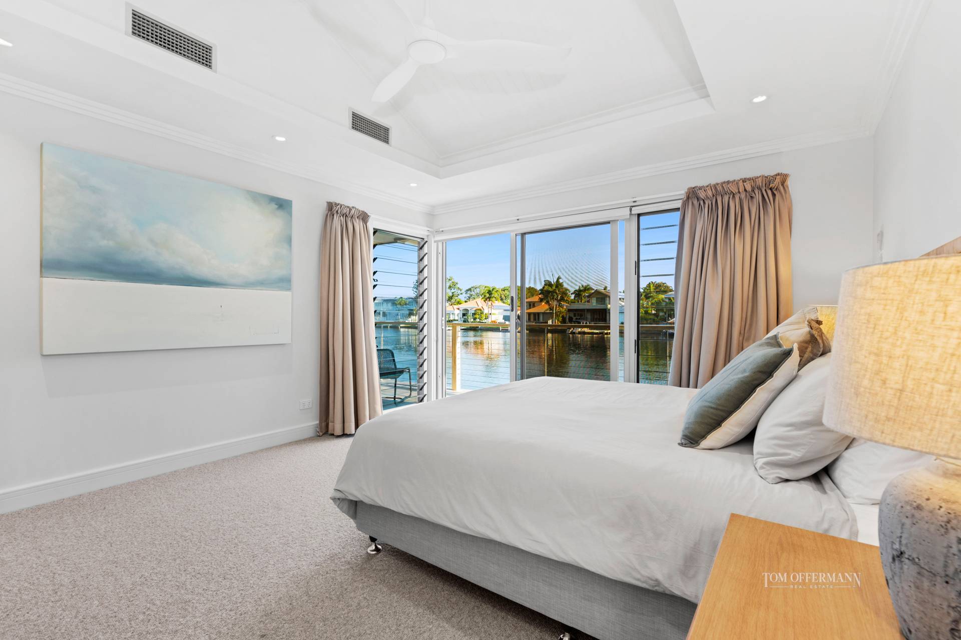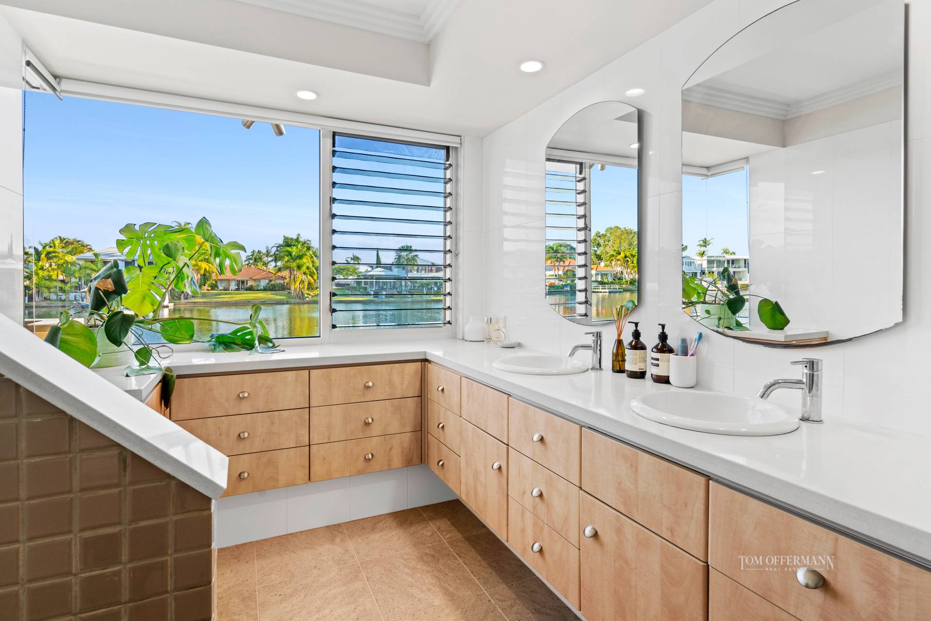 The bedrooms are carpeted including the king suite which opens to the terrace, has those wonderful views of the waterways plus high VJ-coffered ceiling ceilings, a large ensuite also with those views and a walk-in robe. The west wing bedroom has plantation shutters, custom bunk bed, built-in robes. The adjacent bathroom has a separate two-way door to the laundry, and in the east wing a king bedroom has a built-in robe, ensuite and access to the pool terrace. Next door is study.