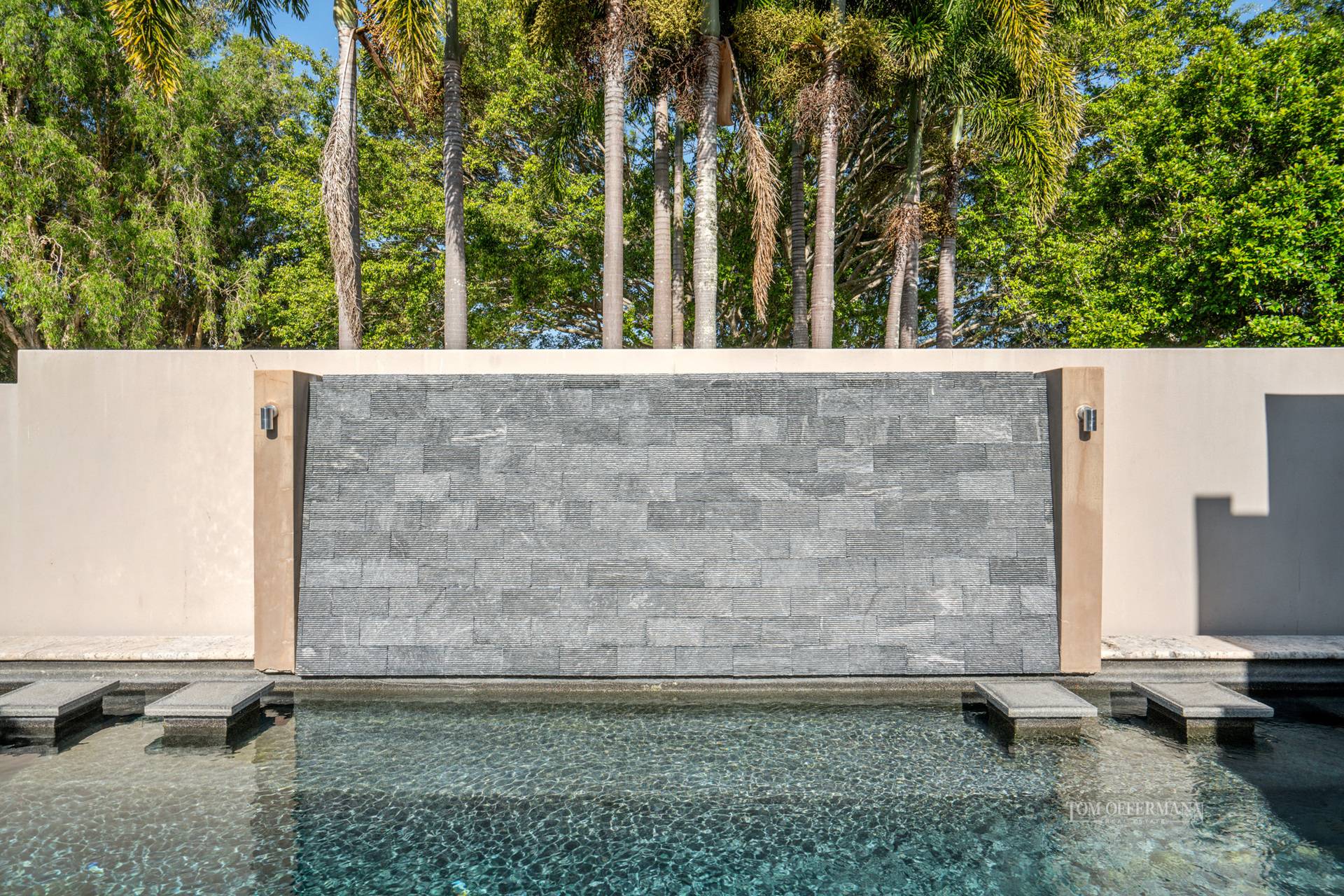 Another leisure space is off the hallway. It has customised cabinetry, opens to an undercover terrace offering a shady space away from the terrace surrounding the shimmering pool with feature water wall.