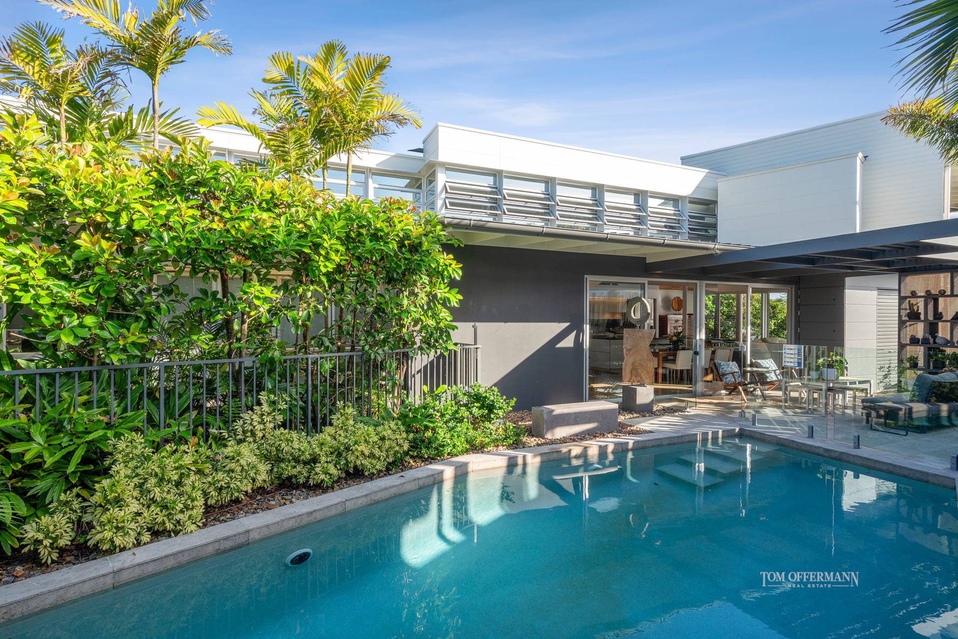 Alternatively, on the northside is a true oasis of calm, the pool surrounded by garden and an undercover terrace. There's storage-aplenty for towels and equipment.
