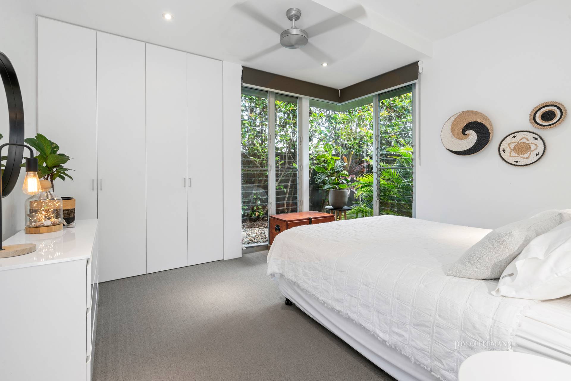 Looking for the ultimate master suite with frameless corner windows, undercover terrace and wide views over two canals? It is upstairs along the mezzanine hallway and to suit any fashionista has a walk-in robe boasting a vogue European interchangeable system and large central storage ottoman. The ensuite complements with a spa bath and mirrored cabinetry.
