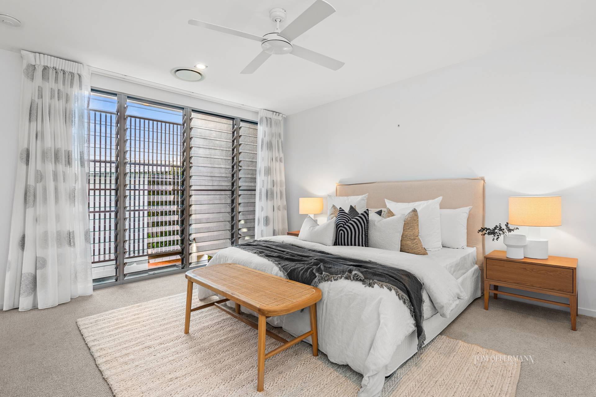 Downstairs are two bedrooms. On the north side is a bedroom with an ensuite, retractable screen doors/separate entrance opening to a courtyard. In the west wing the bedroom has a built-in robe, and a bathroom is adjacent.