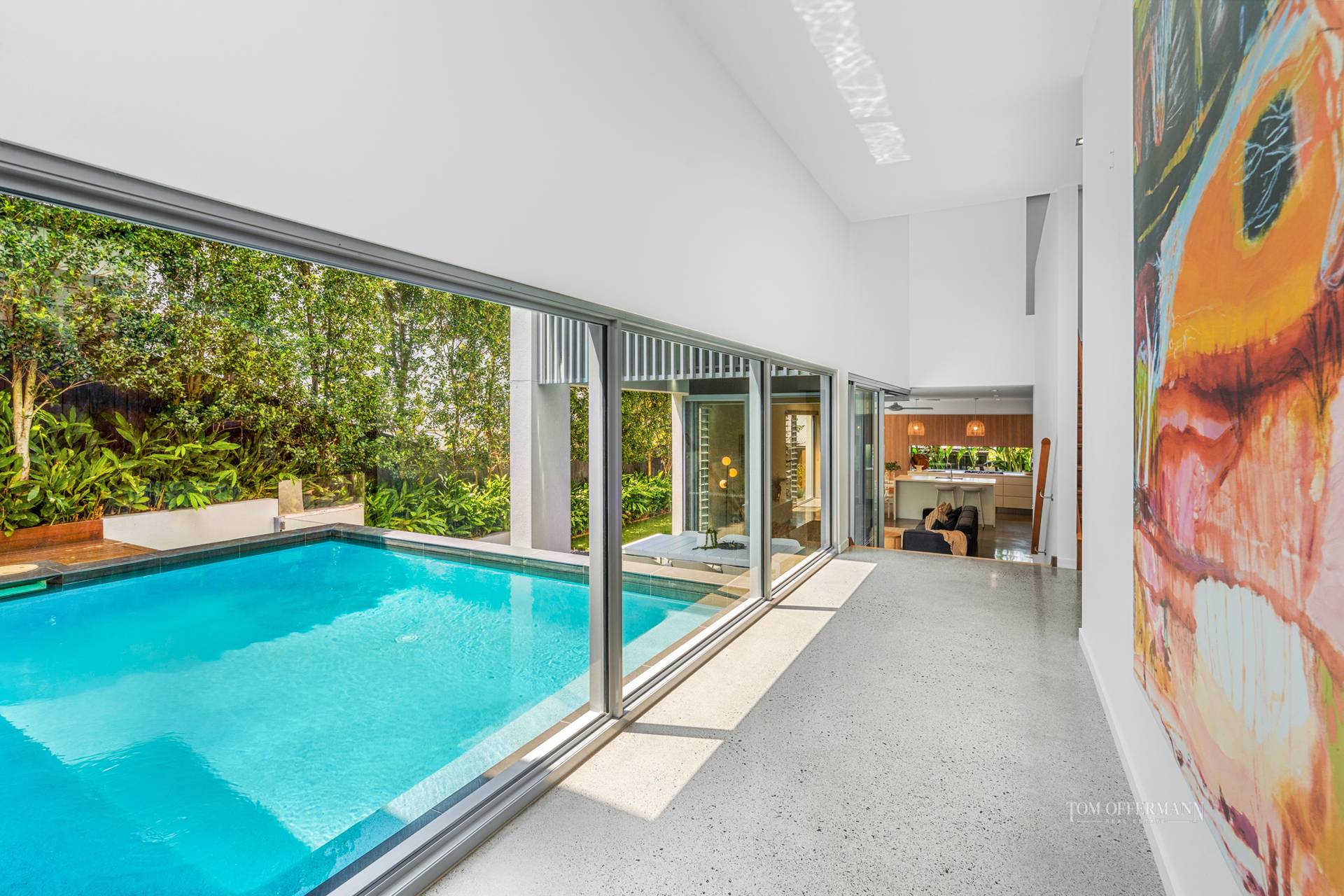 It's impossible not to be distracted by banks of disappearing lanky floor-to-ceiling sliders on the eastern side. They coalesce seamlessly with the glistening aquamarine pool and the alfresco entertaining area. Thoughts of wonderful parties come to mind.