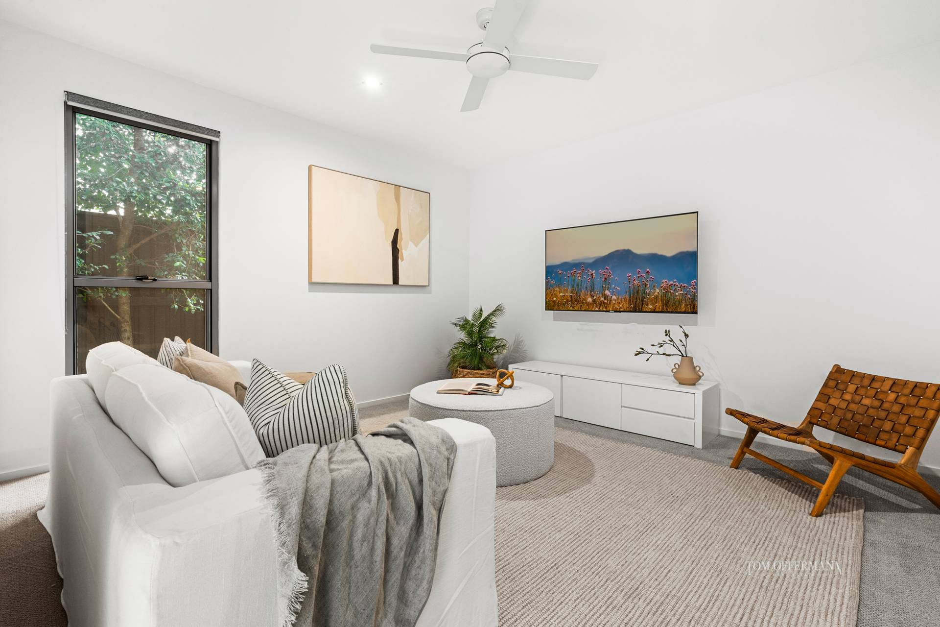 Upstairs, the sumptuous king suite with high ceiling, louvres and wispy sheers, evokes a feeling of calm. It looks through the exterior slats to the pool, has an ensuite with charcoal wall and floor tiles, lustre feature, stone topped two-basin cabinetry, walk-in shower, separate toilet plus a walk-in robe. Two bedrooms have built-in robes, share a mocha tiled bathroom with bathtub and separate toilet. Central is a lounge maybe a teen's hangout space.