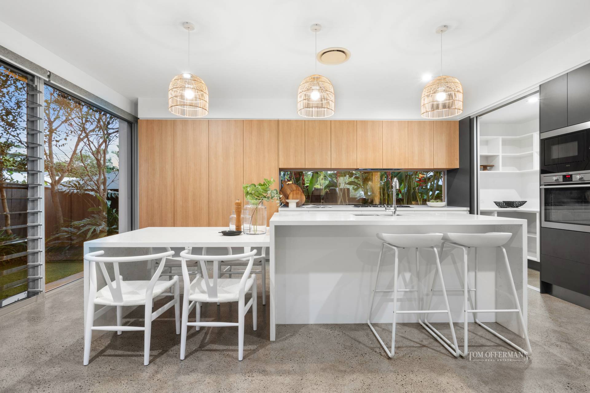 The custom-designed, capacious L-shaped kitchen with long stone-topped island bench and extension dining area, has the full complement of high-end appliances a walk-in pantry and window splashback looking out to the garden of bright red heliconias. It will undoubtedly impress those who channel the worldly Nigella Lawson or just prefer a casual barbeque.