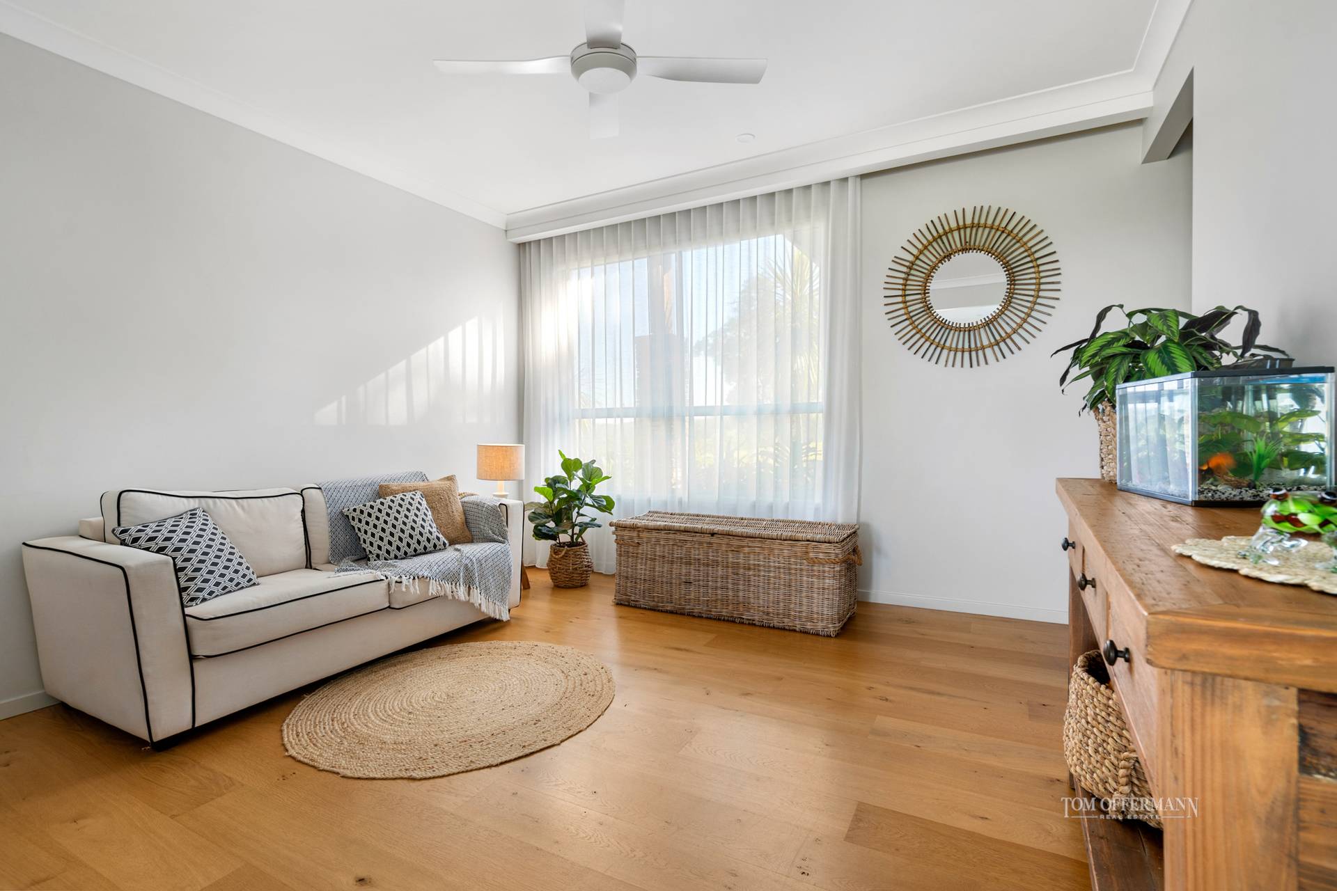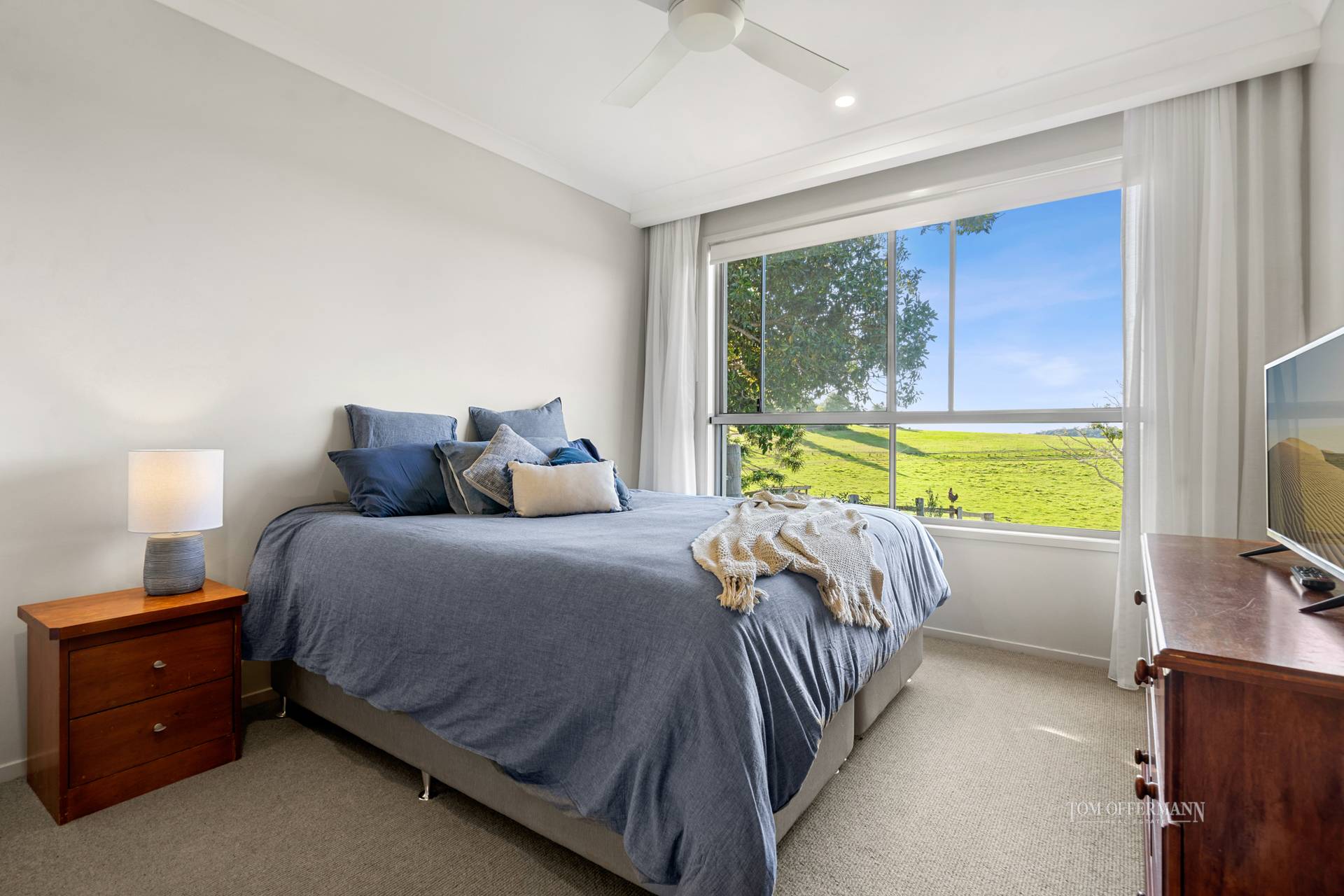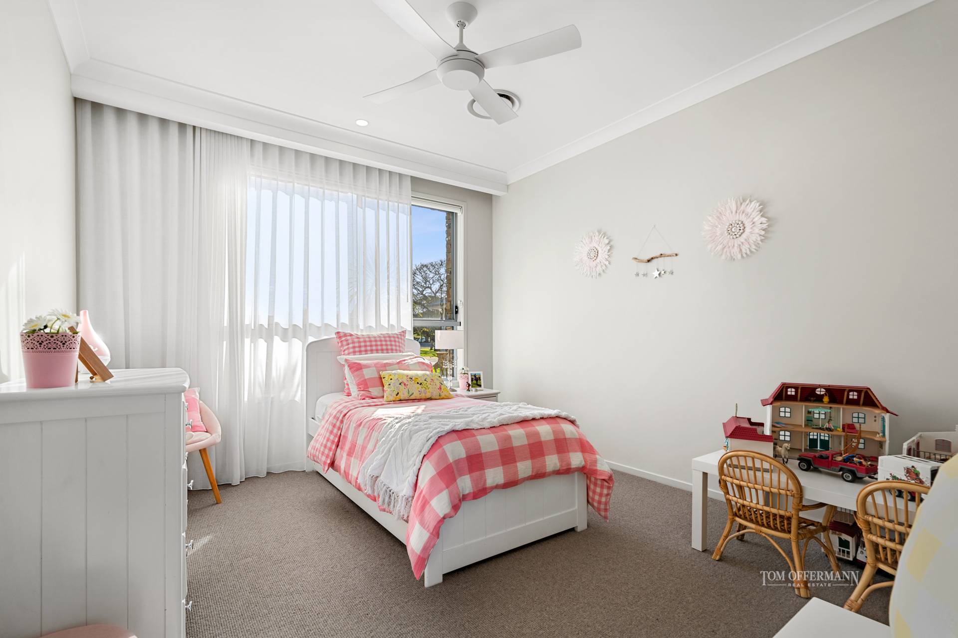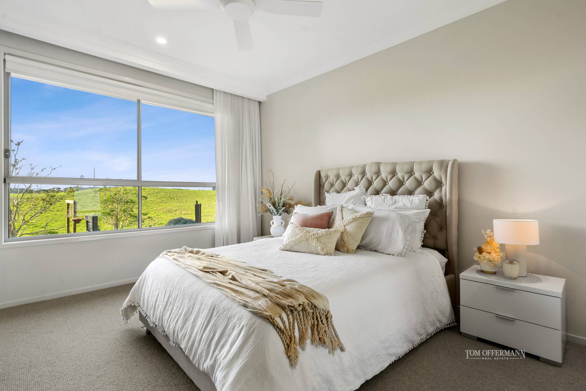 high ceiling; ducted air/fans; ceiling to floor sheers; auto blinds;