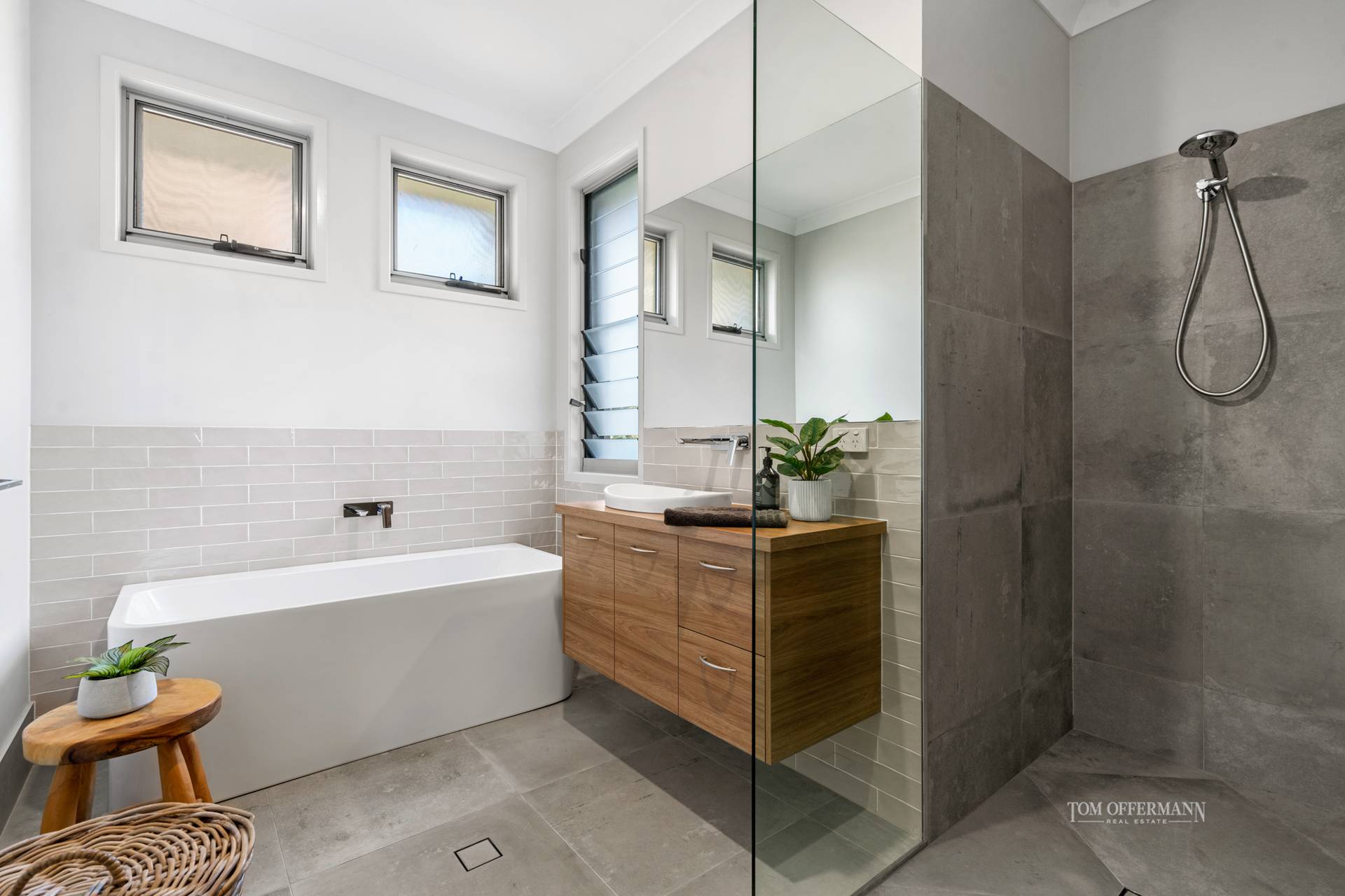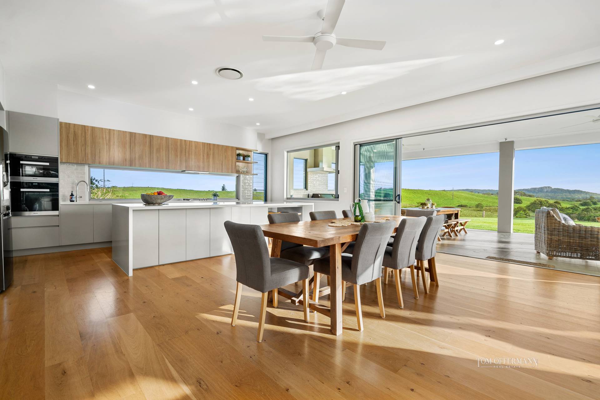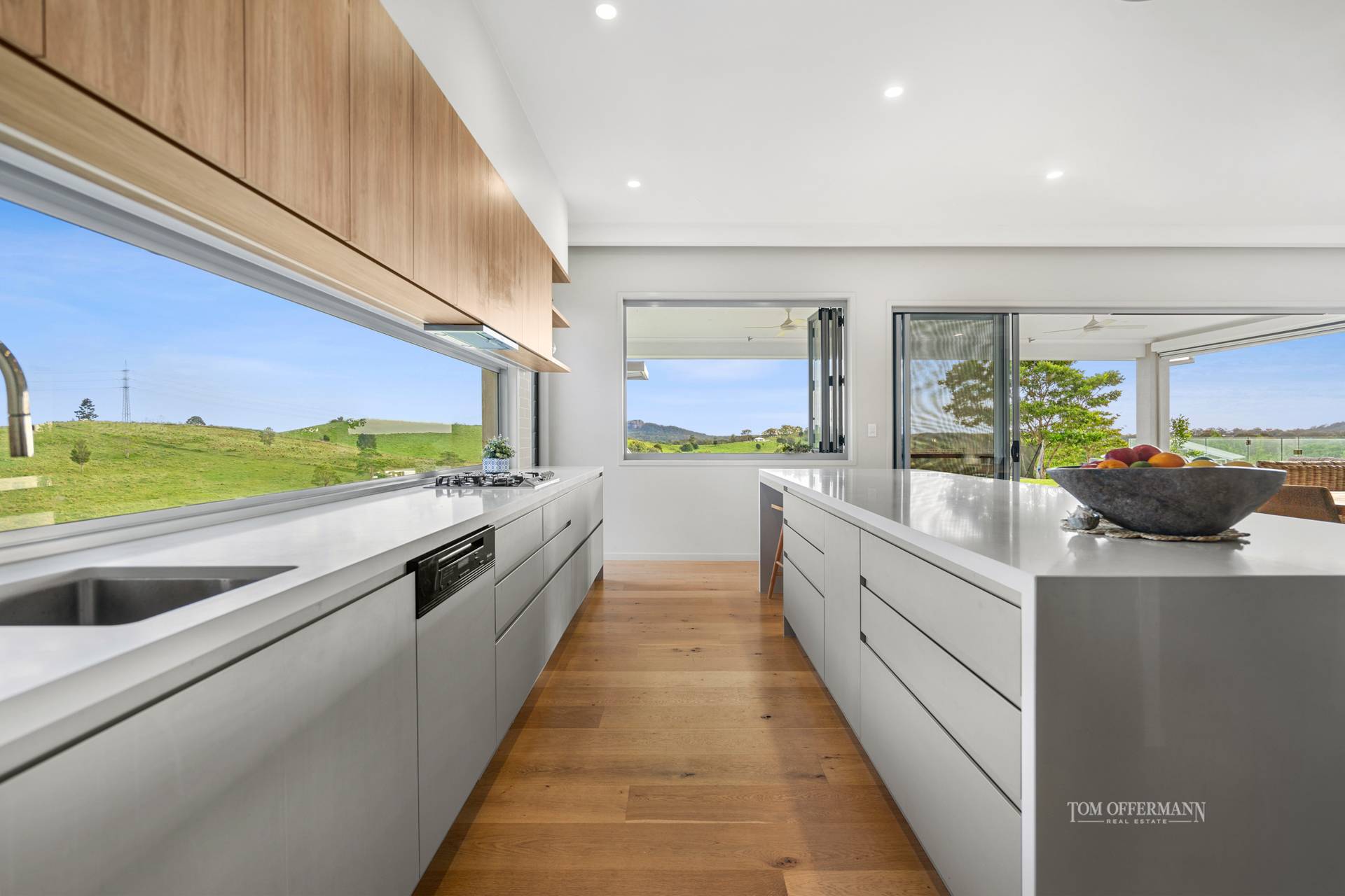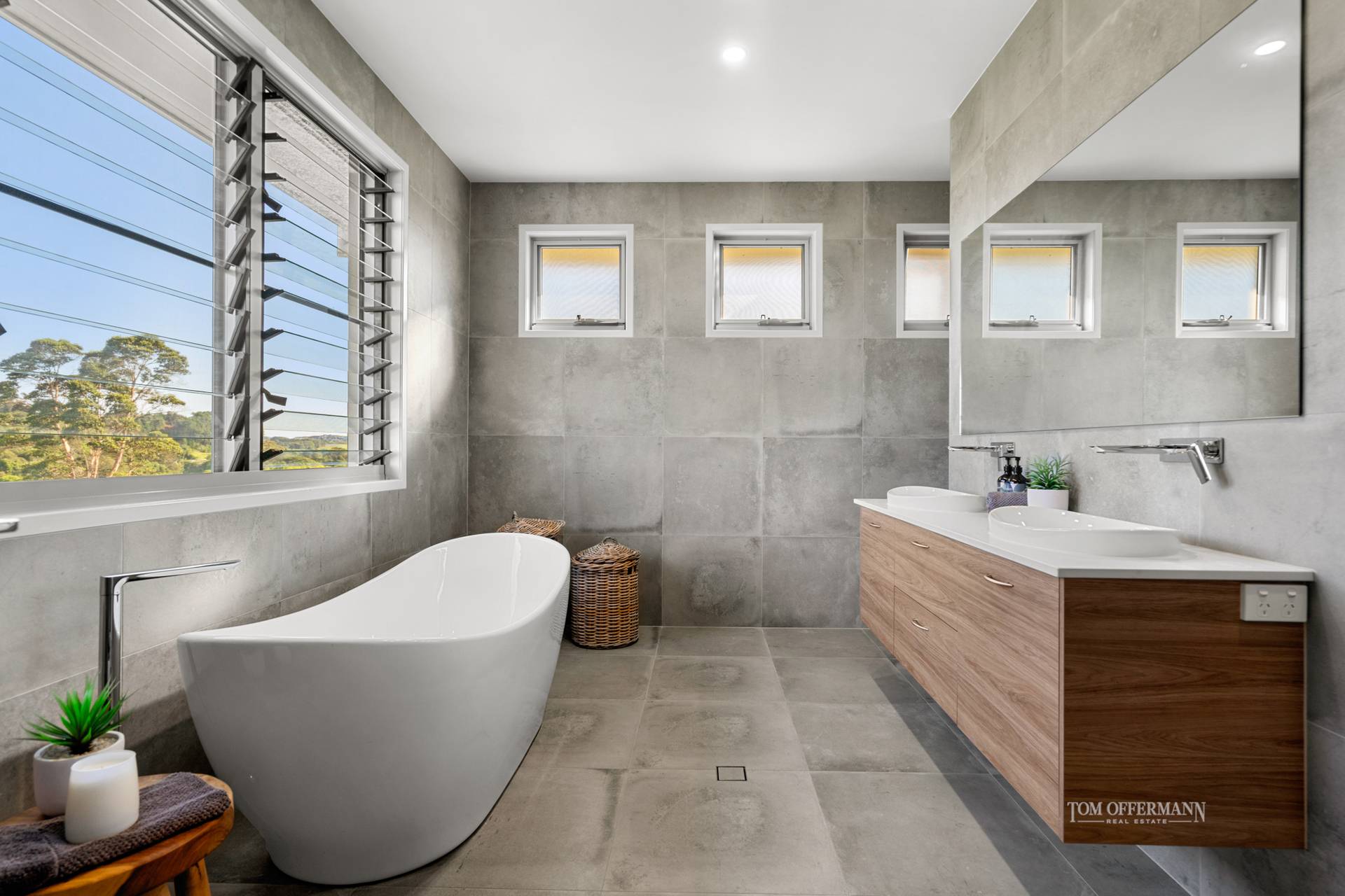 admire the pool and Mt Cooroy. Note the monochromatic palette and size, similarly the walk-in robe and ensuite with grey Italian stone tiles and oval free-standing bath tub, where you can also drink in the views as you soak away.