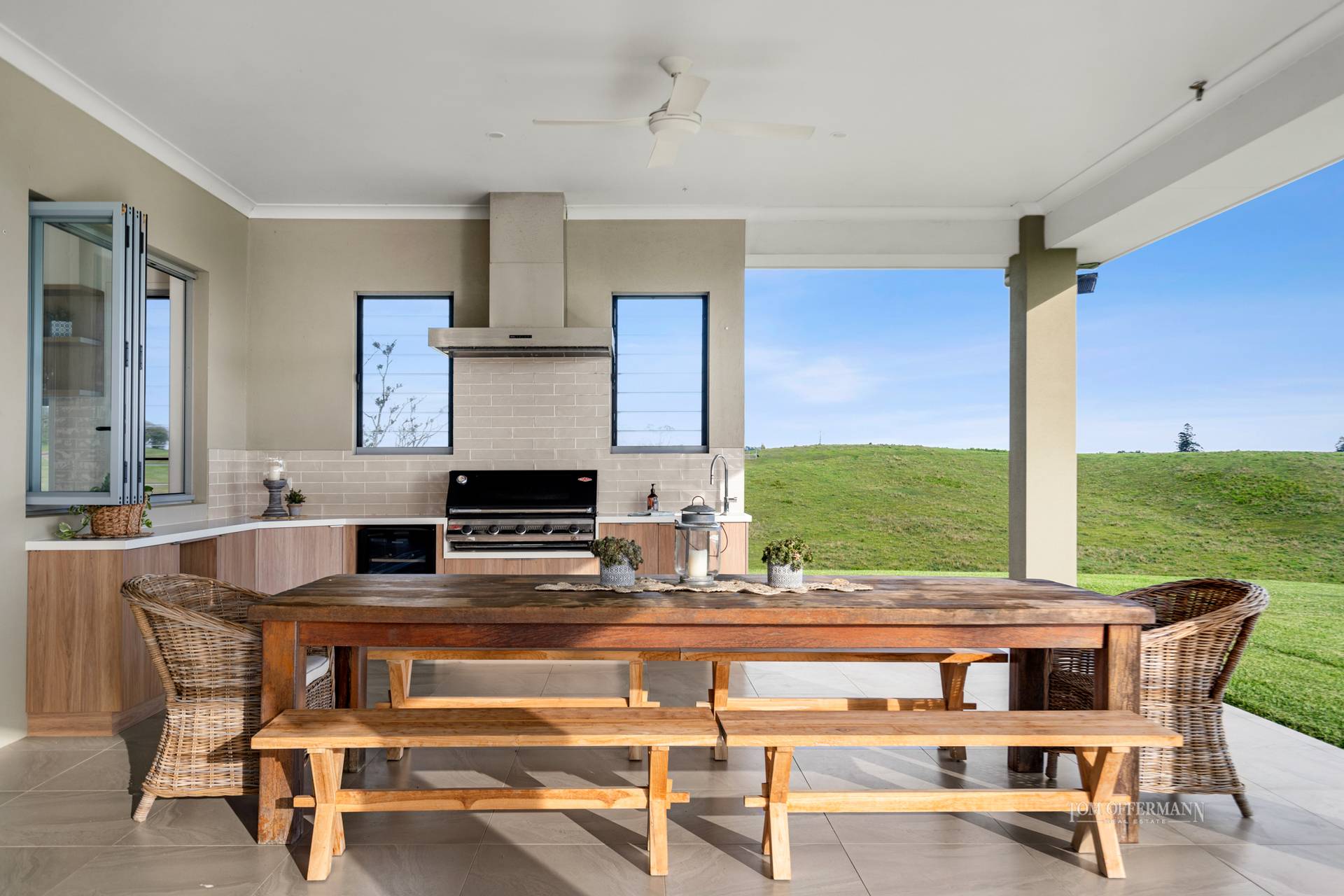 undercover w custom kitchen stone-topped cabinetry, BBQ, tiled