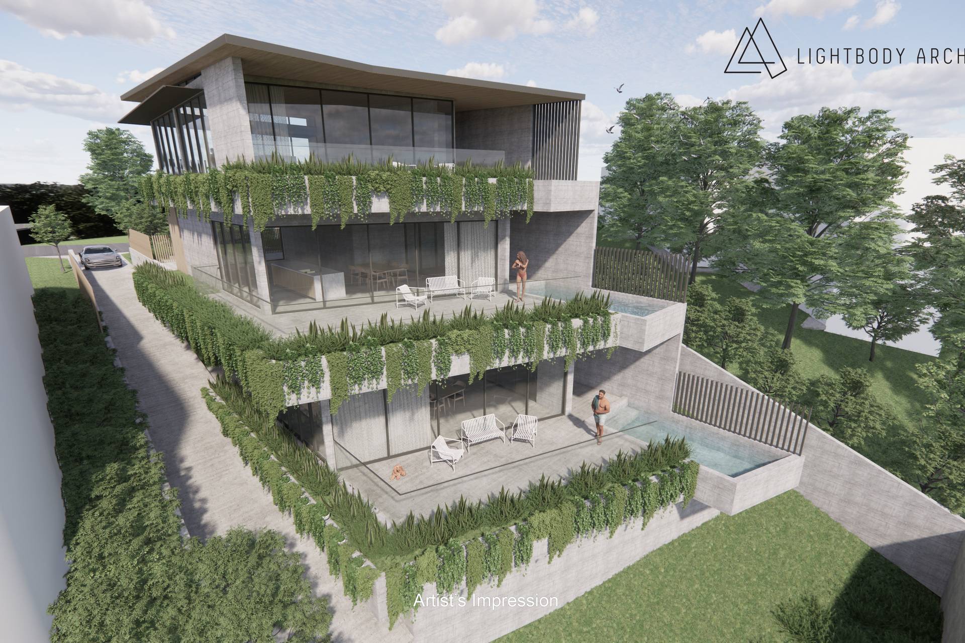 Finally, after fifty years of multi-generational family celebrations, the modest little green and cream cottage with frangipanis out the front, and a rear garden melding with the Noosa National Park reserve, the time is ripe to demolish, develop and make the move to first class.