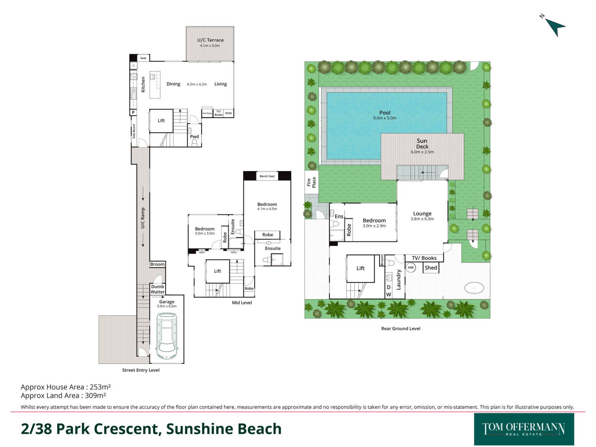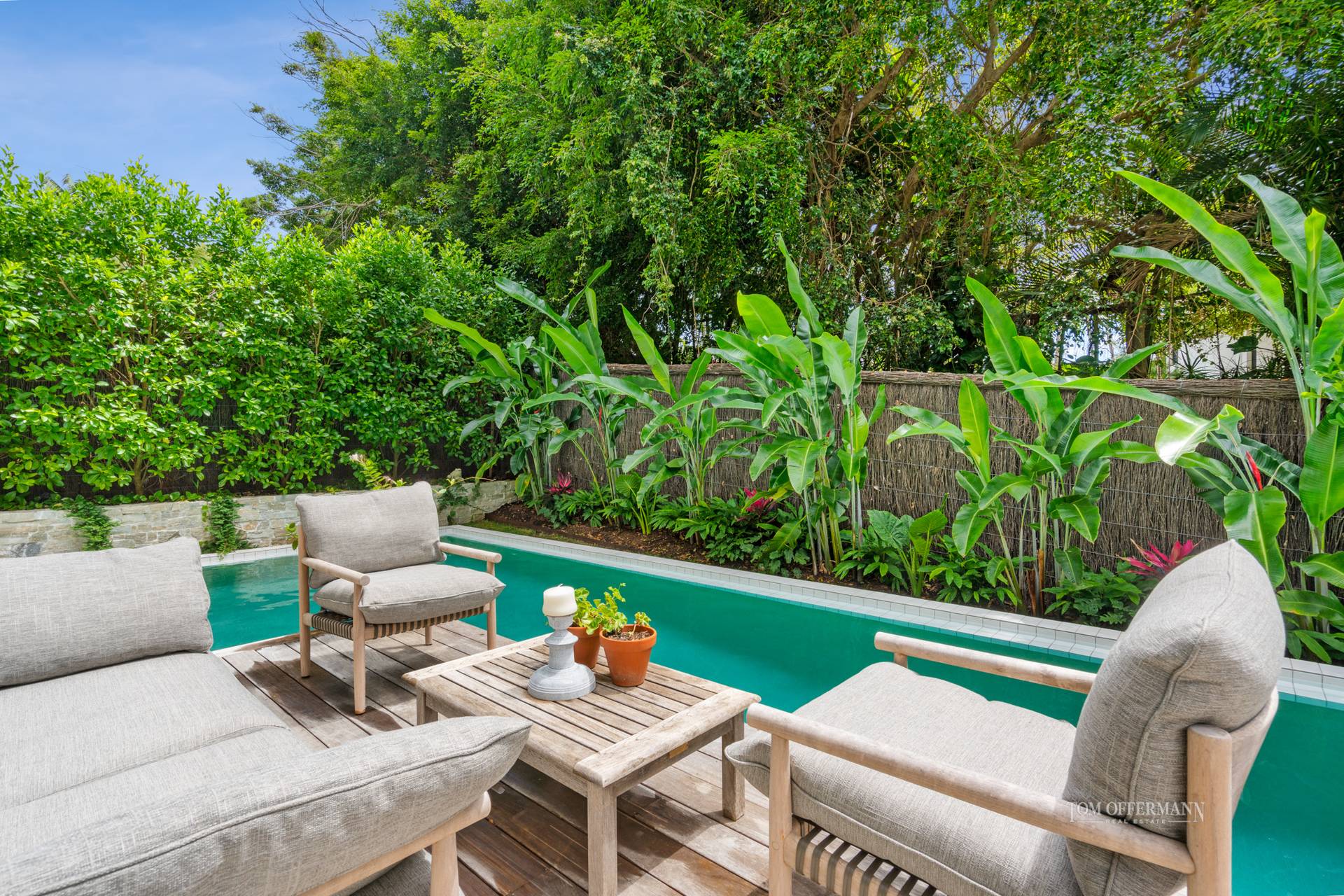 On the ground level, the second lounge room overlooks the swimming pool terrace plus entertaining with all the desirables; bbq, lawn area for kids/dog, outdoor shower and bath, all privately set in lush tropical gardens. The beach access to a patrolled surf beach is via the security gate leading onto a pathway.