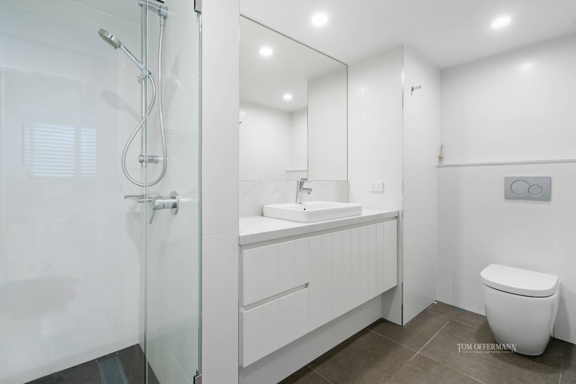 - About: Ground level; 180-degree uninterrupted water views; north-facing aspect incl terrace 6.8m x 2.5m w outdoor dining setting; Hamptons inspired renovation w white VJ profile details kitchen & walls; timber, blues, greys & white palette; pale grey porcelain floor tiles; grey linen sheers to terrace; fans/aircon; living area w sumptuous grey sofa & armchair, grey rug, timber side table; entertainment console, smart TV, timber dining table & 6 chairs + seaside-themed artwork/mirror reflecting view; kitchen L-shaped w stone bench tops & island/breakfast bar; pantry; Bosch dishwasher, oven & cooktop; Ilve microwave; Westinghouse fridge; 2 Bedrooms, king and twin w louvres & built-in robes; stone topped ensuite, bathroom & laundry