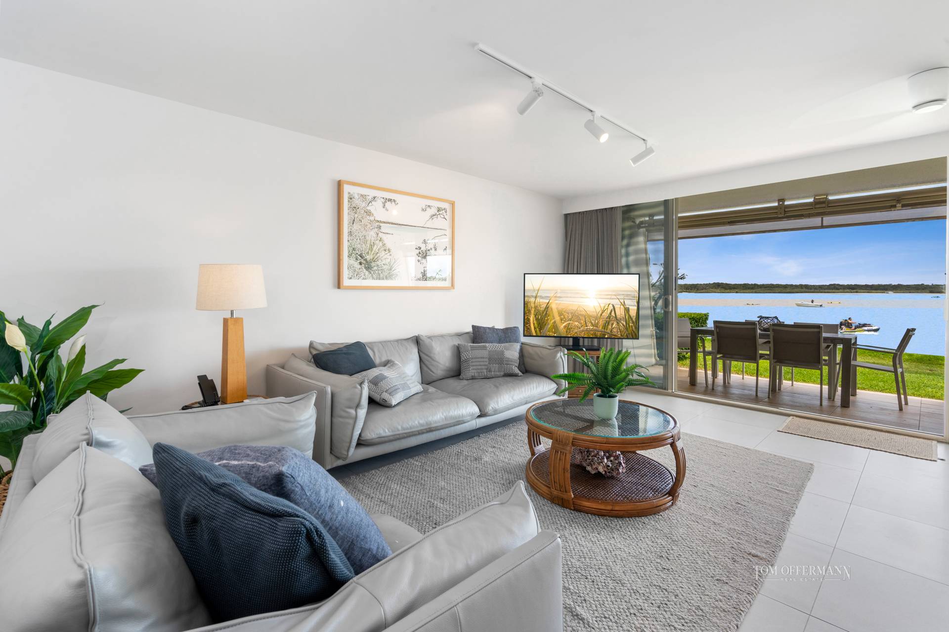 Blessed with a breathtaking position, simply dazzling 180-degree uninterrupted views, embracing the waterfront on a salubrious stretch of the Noosa River, dotted with bobbing boats, pelicans gliding above, and kids building sandcastles on the white-sand beach below, is a stunning apartment.