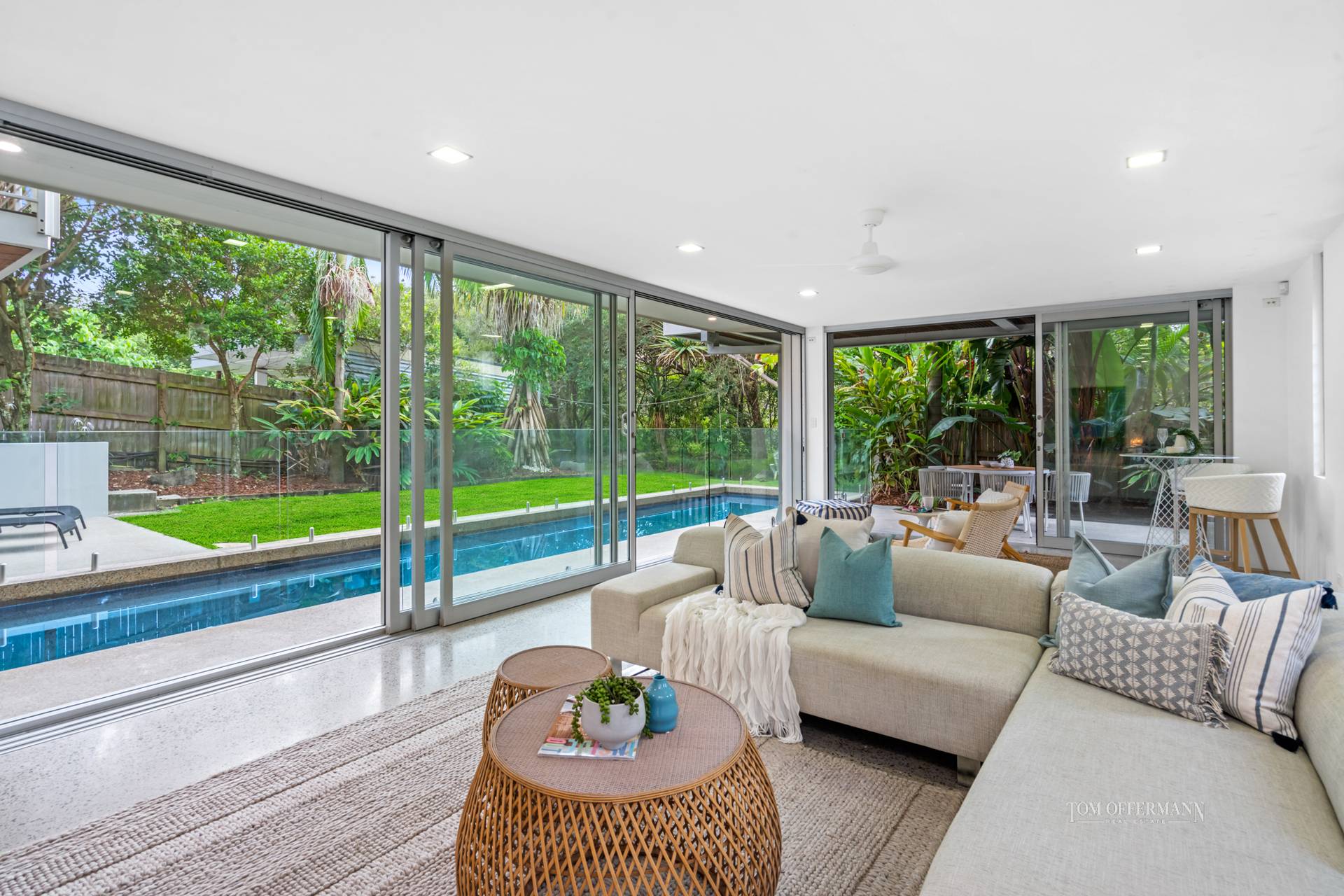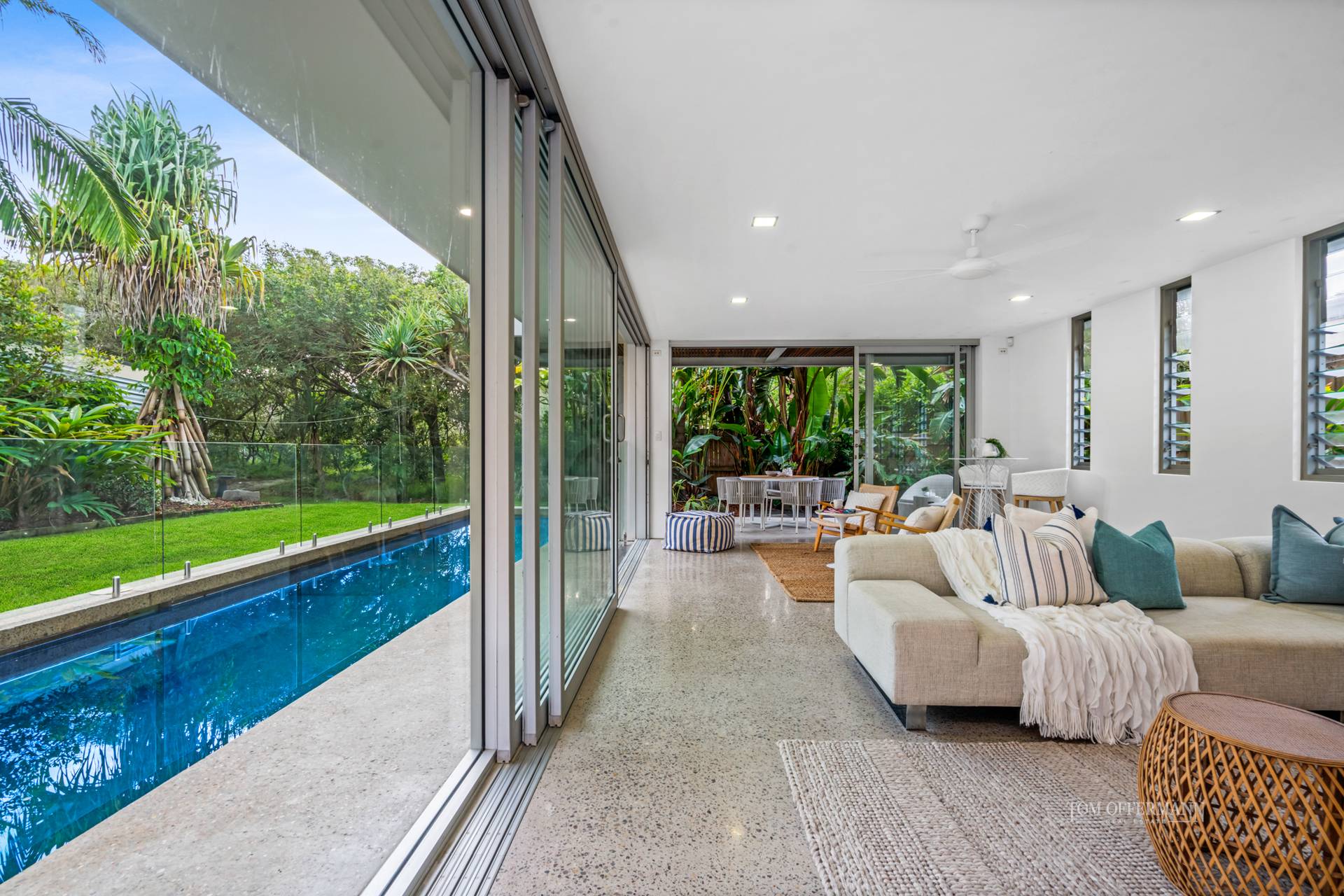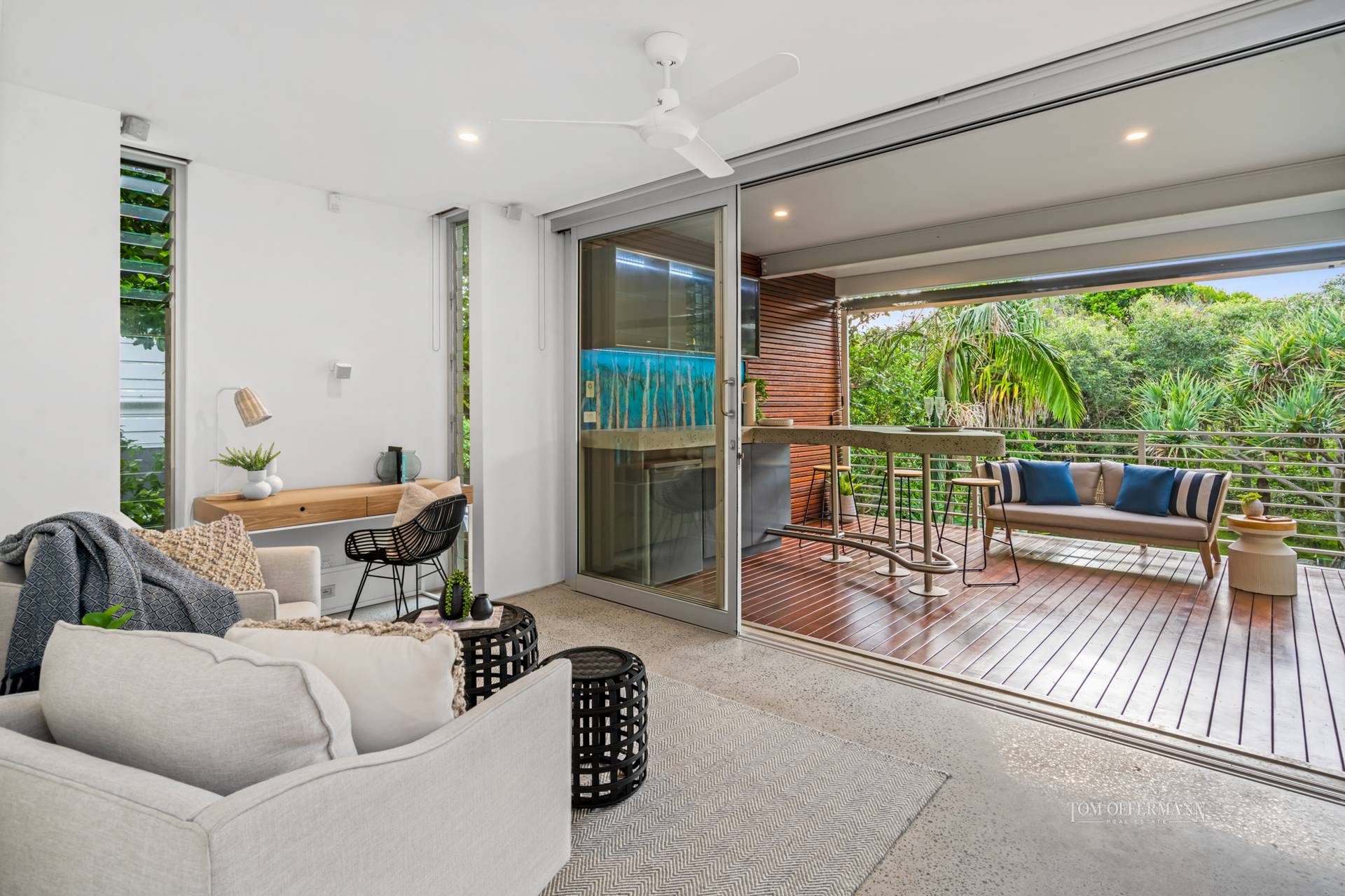 The cool beachy aesthetic coalesces with outdoors, thanks to picture windows and banks of disappearing sliders, making an immediate connection to an undercover terrace with a built in outdoor kitchen.