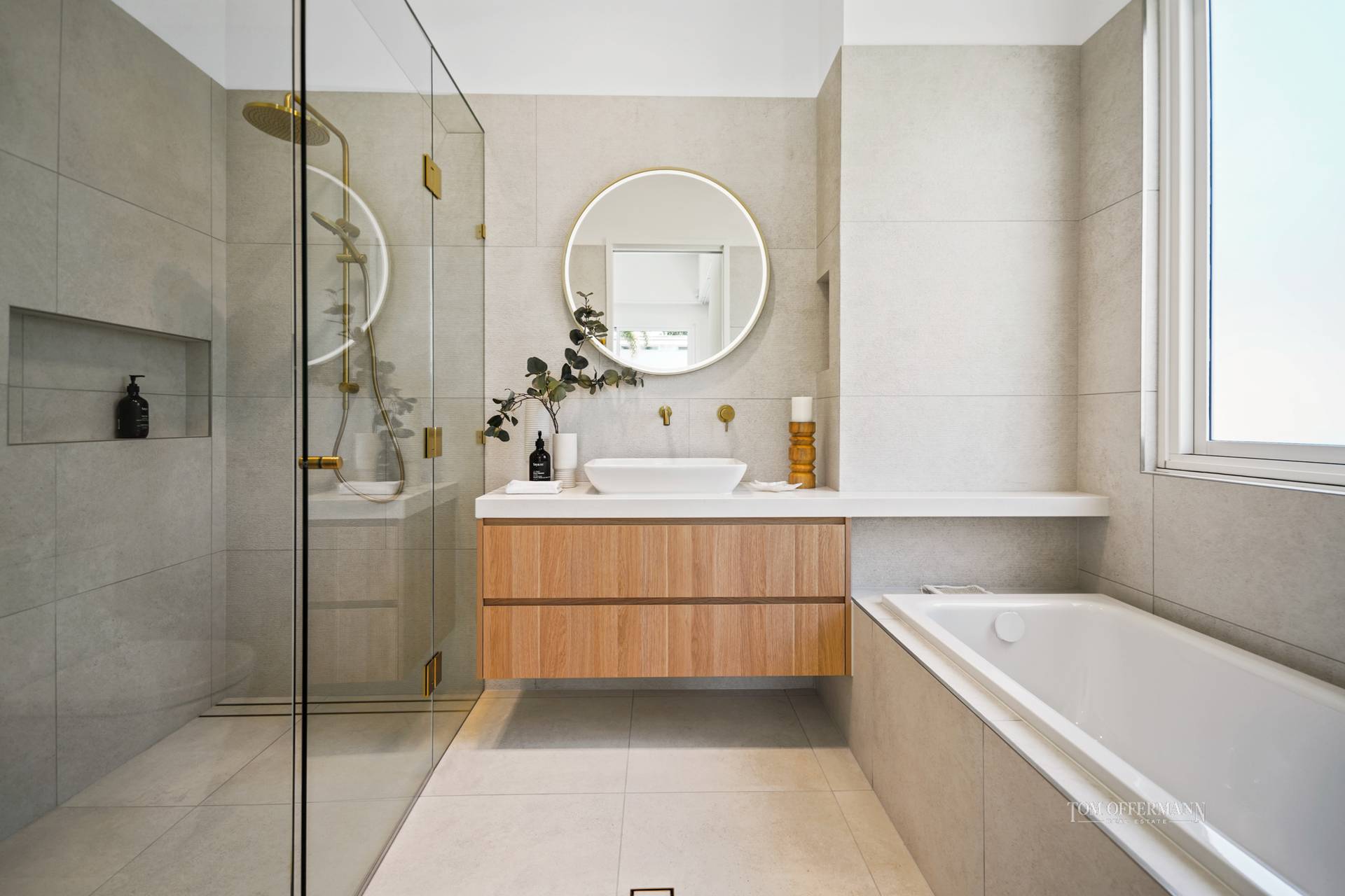 When it comes to dreamtime, there are three carpeted bedrooms with wispy white sheers and a monochromatic palette. The master suite has a terrace wrapping the north and eastly sides, a walk-in wardrobe and large ensuite with a bath tub and imported Italian Silkstone tiles. Two queen-size bedrooms have built-in robes, one has access to the easterly terrace with verdant views plus there is a share bathroom.