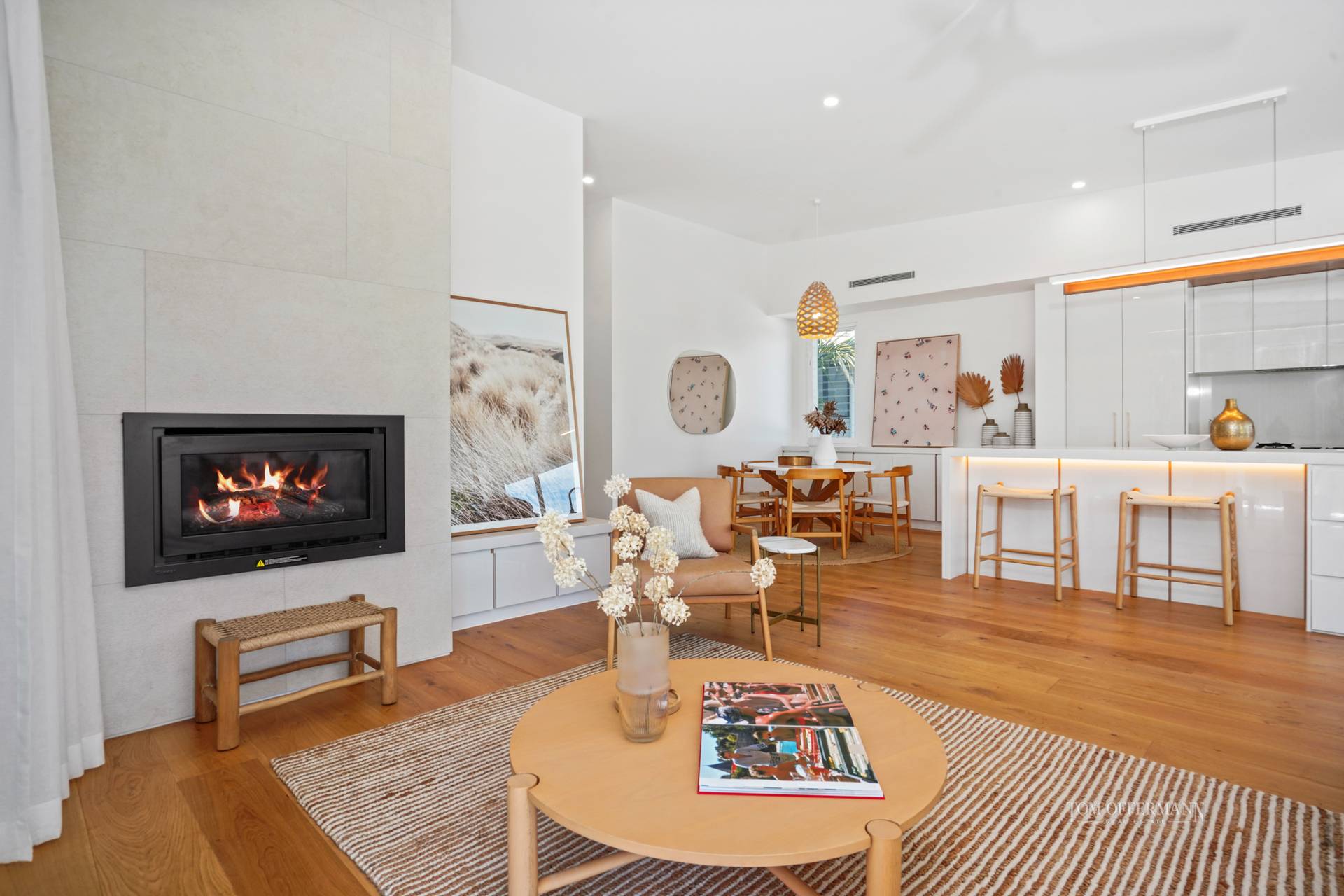 It indulges definitive avant-garde flair, with lofty ceiling heights and the extensive use of glass via floor-to-ceiling totally disappearing doors which maximise natural light. It seemingly shadow dances on endless honey-hued French oak floors, melding effortlessly with the uber-contemporary open plan living space, custom cabinetry including a gas fireplace, and over the dining table, a chandelier-style pendant by the world-renowned David Trubridge.