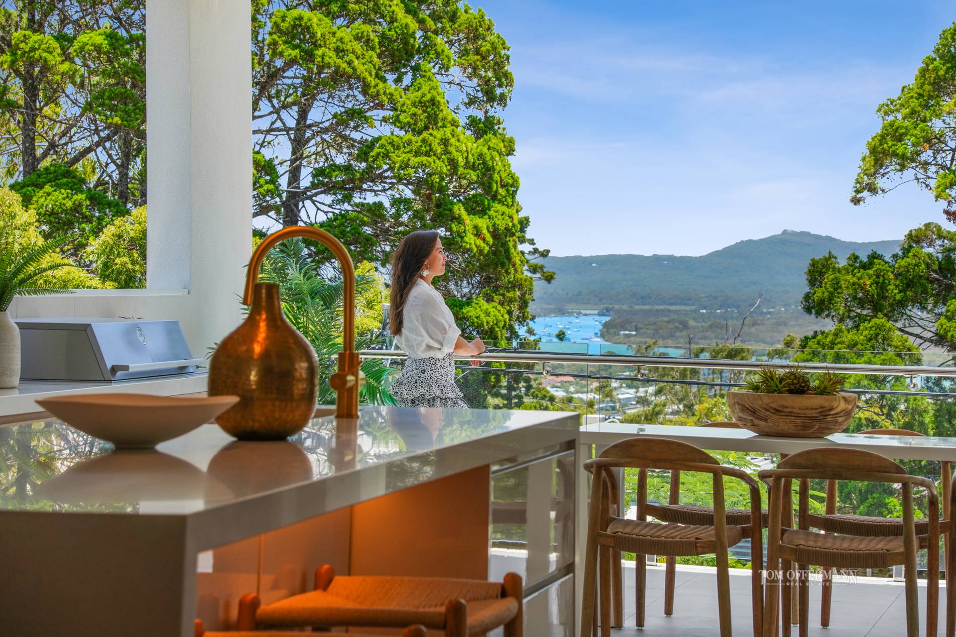 Indoors coalesces with the expansive undercover terraces wrapping two sides. Stylistic custom slatted timber shades feature on the northside, and on the westside, those to-sigh-for views form the perfect backdrop for sun worshippers, sundowners, romantic dinners by moonlight or hosting a bevy of friends and family. Easy entertaining when the integrated outdoor kitchen has stone-topped waterproof cabinetry, sink, drinks fridge and the latest barbeque grill.