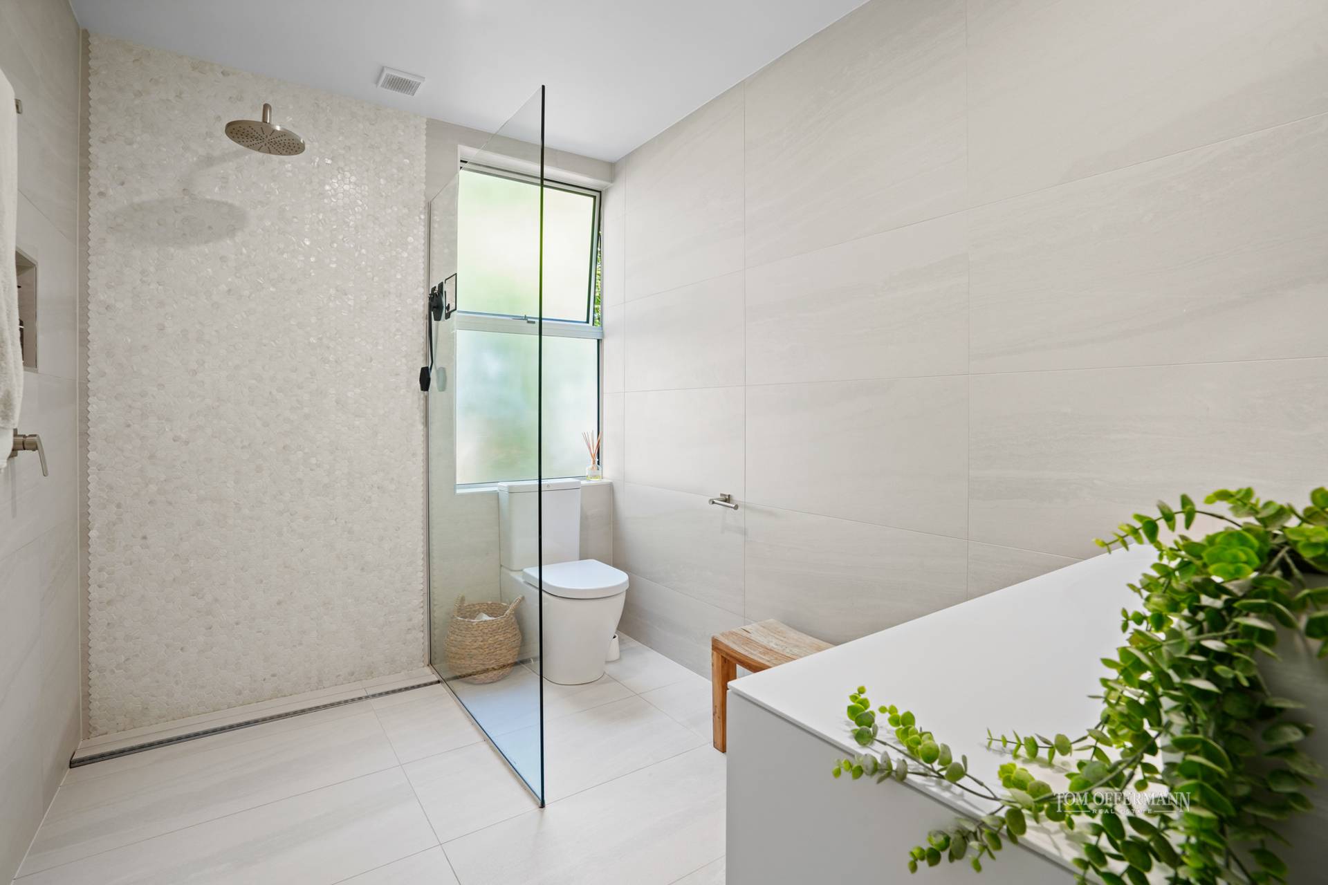 Upstairs, the barefoot coastal living continues. Take in the expansive use of glass and high ceilings capturing an abundance of natural light, and a lush greenery outlook with ocean view. The galley-style kitchen complete with stainless steel appliances, stone and seating adjoins the dining space with luxe pendant lights. The living space with built-in cabinetry flows to another usable outdoor living space, perfect for entertaining.