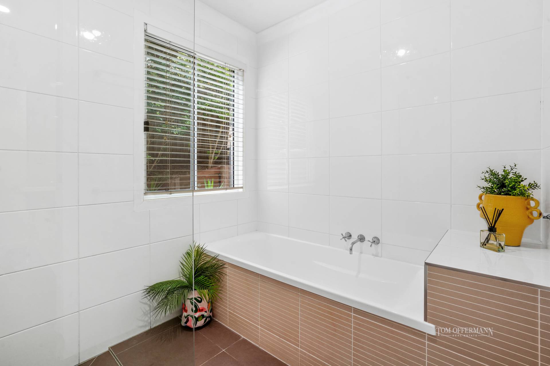 Three generous bedrooms with built-in robes are on this level and share a bathroom with bathtub and powder room. There's direct access to the garage and the dedicated laundry space.