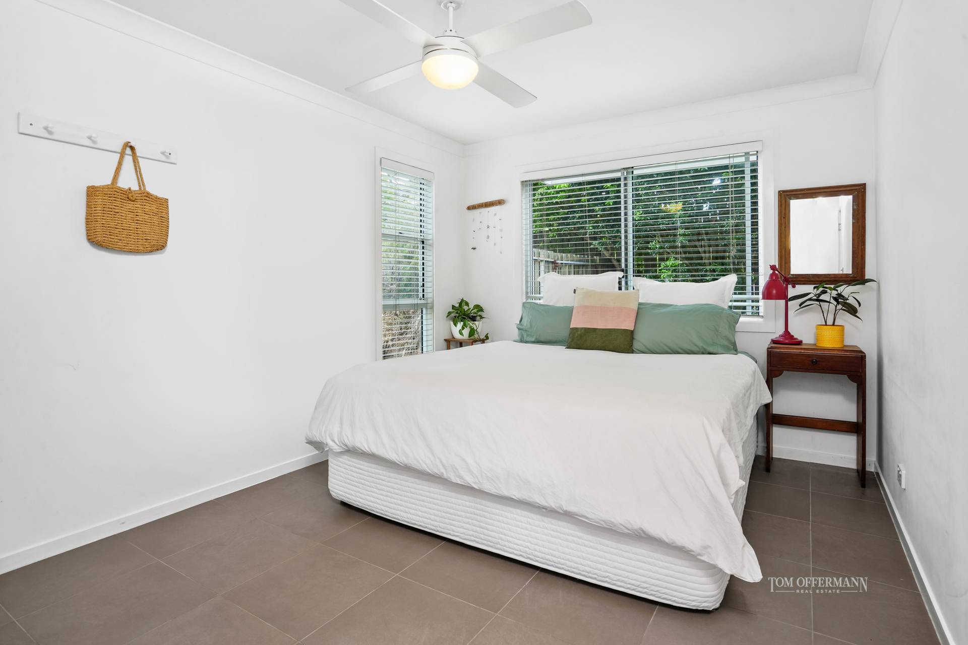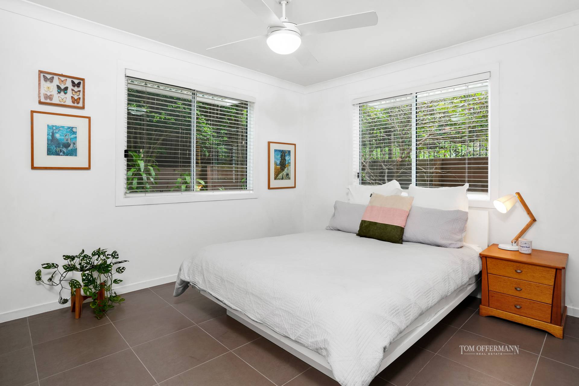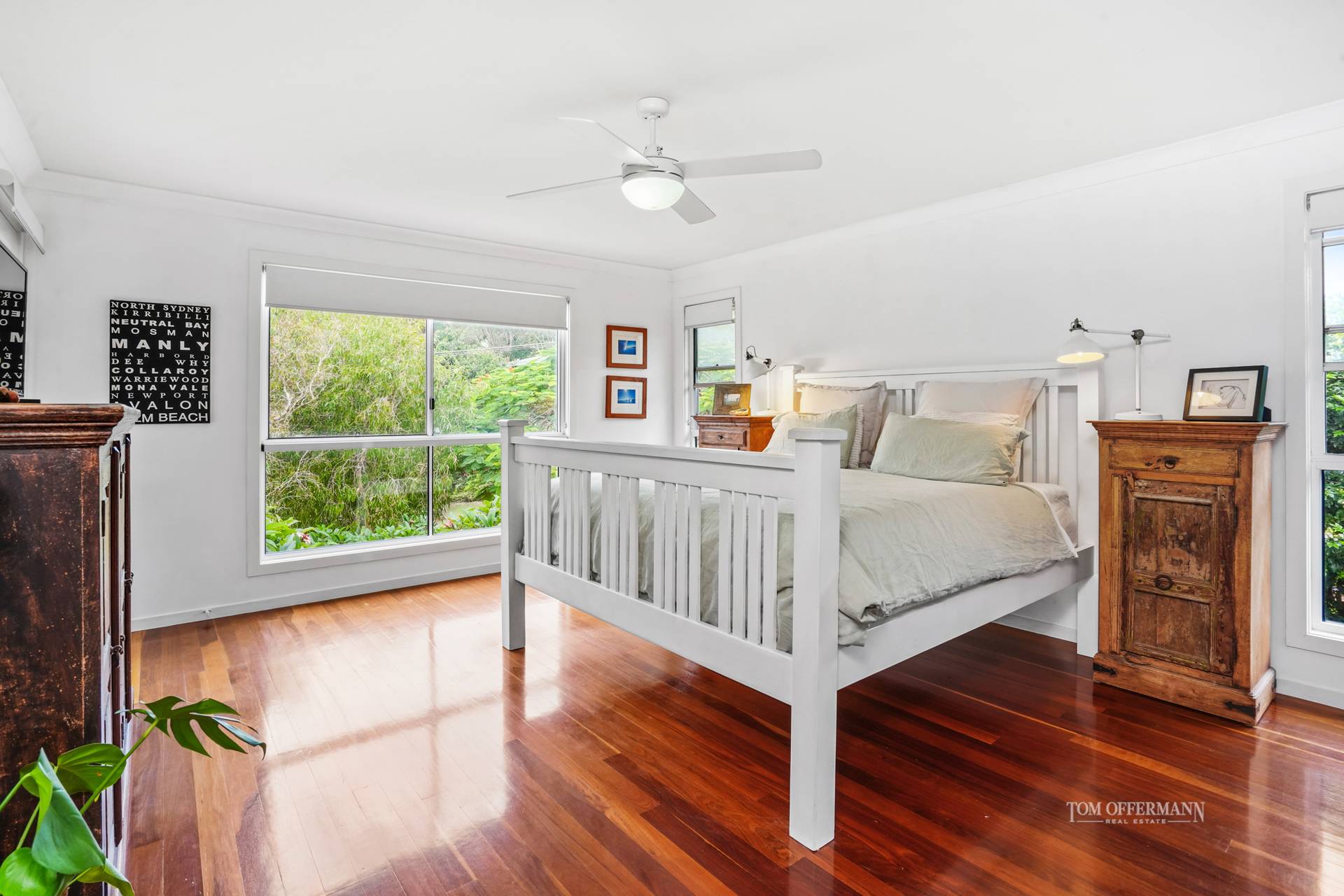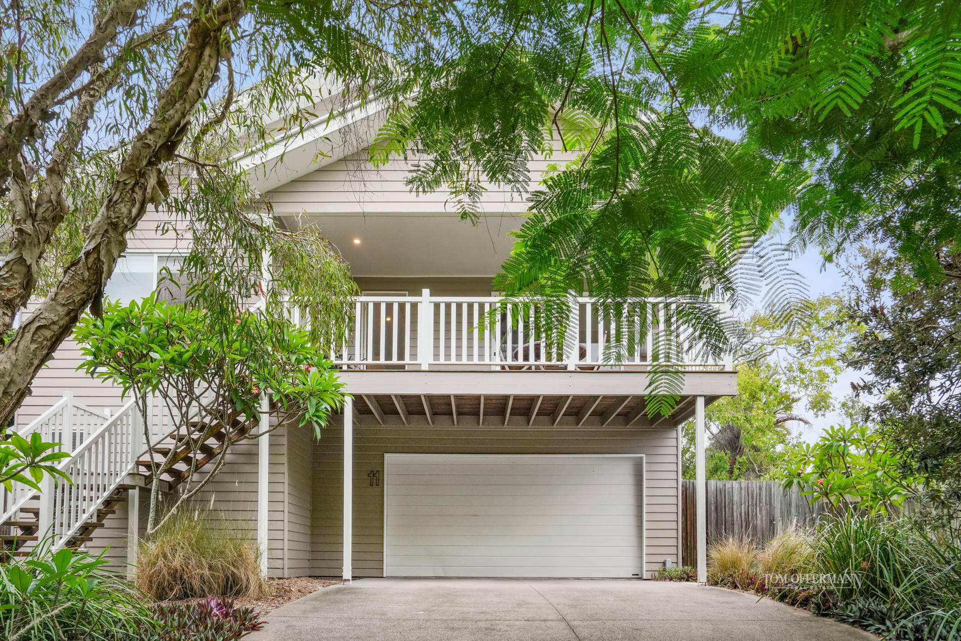 Admire the brilliant red wide-arboured poincianas, frangipanis and black cockatoo-attracting paper barks along the timber-treaded walkway in the front garden, also from the north-facing terrace.