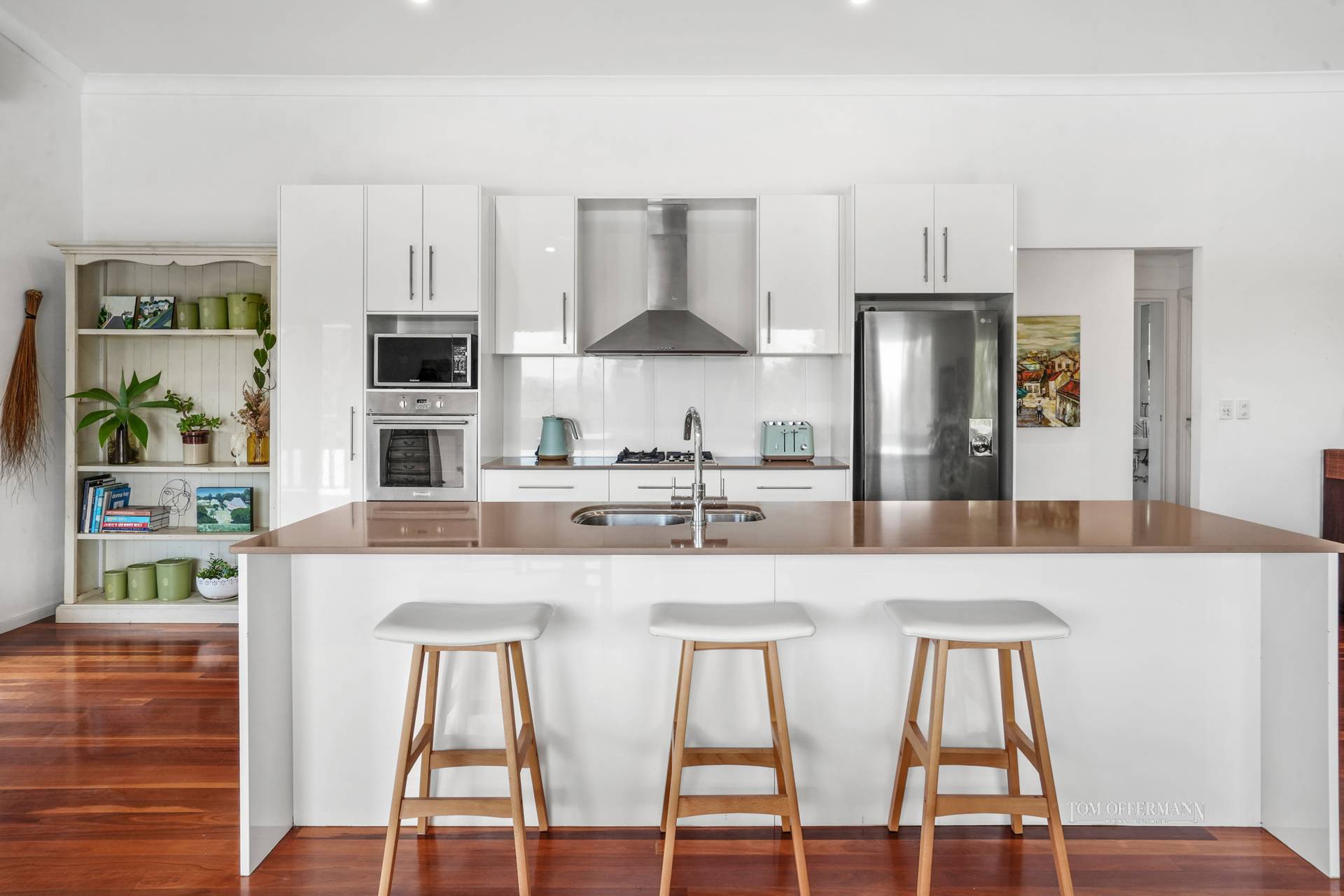 Commensurate with the contemporary design and space is the galley-style kitchen with buff stone-topped white cabinetry, including a long island/breakfast bar, pantry with pull-out drawers and high-end appliances to suit a wannabe master chef.