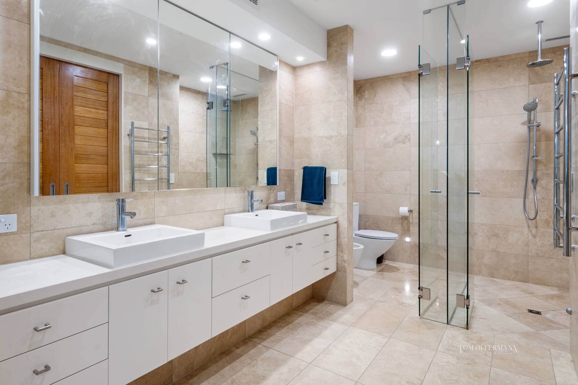 lashings of natural light add sheen to the travertine tile flooring of the prodigious open plan living and dining areas. Gallery-style walls suit large format canvases, and the neutral palette continues into the media room.