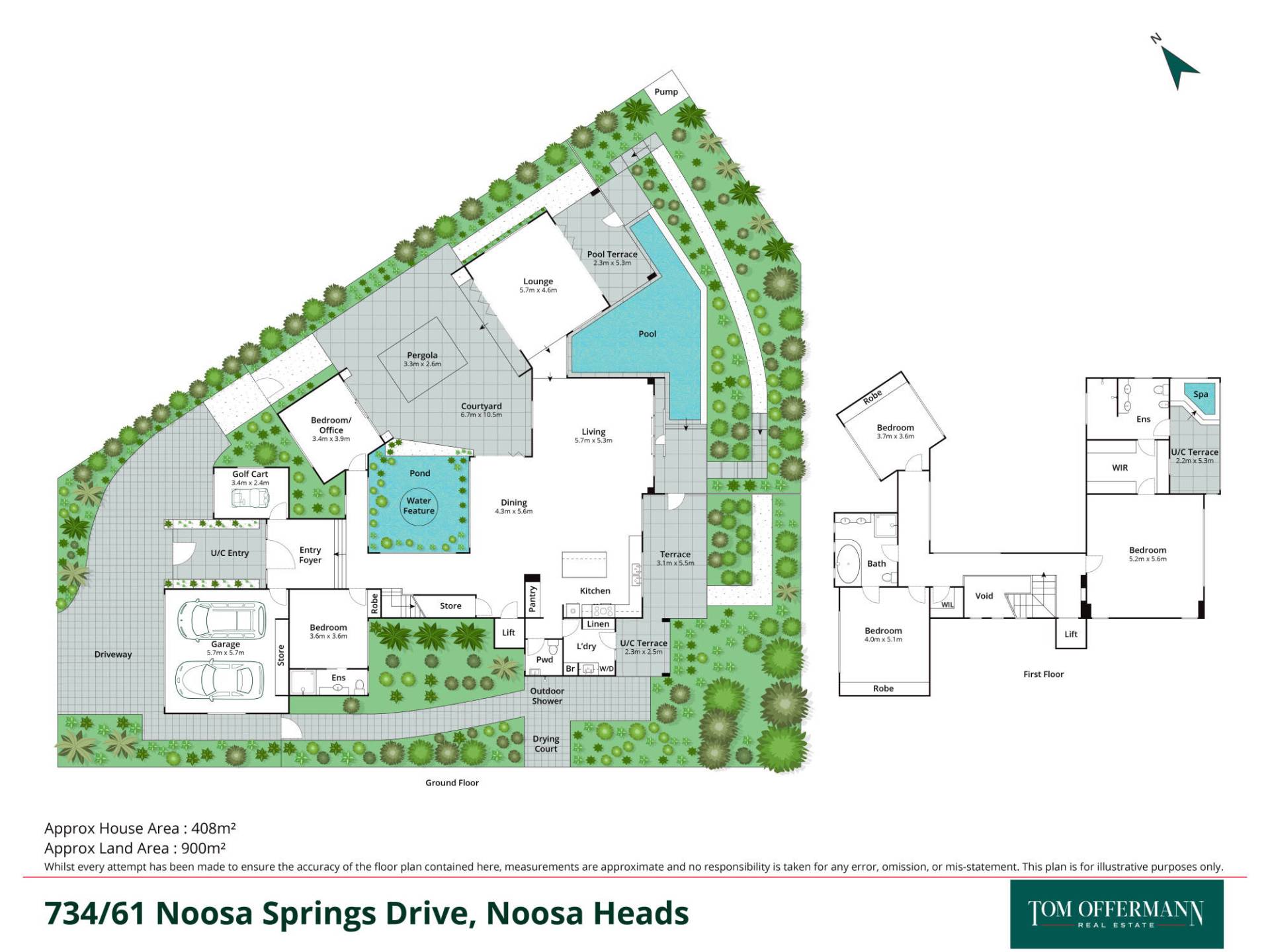 downstairs 1 king size bedroom w built-in robe & ensuite, large office, laundry w storage & drying court; aircon/fans; dble garage w epoxy flooring, storage & internal access; sep golf buggy garage, + room to park your boat.