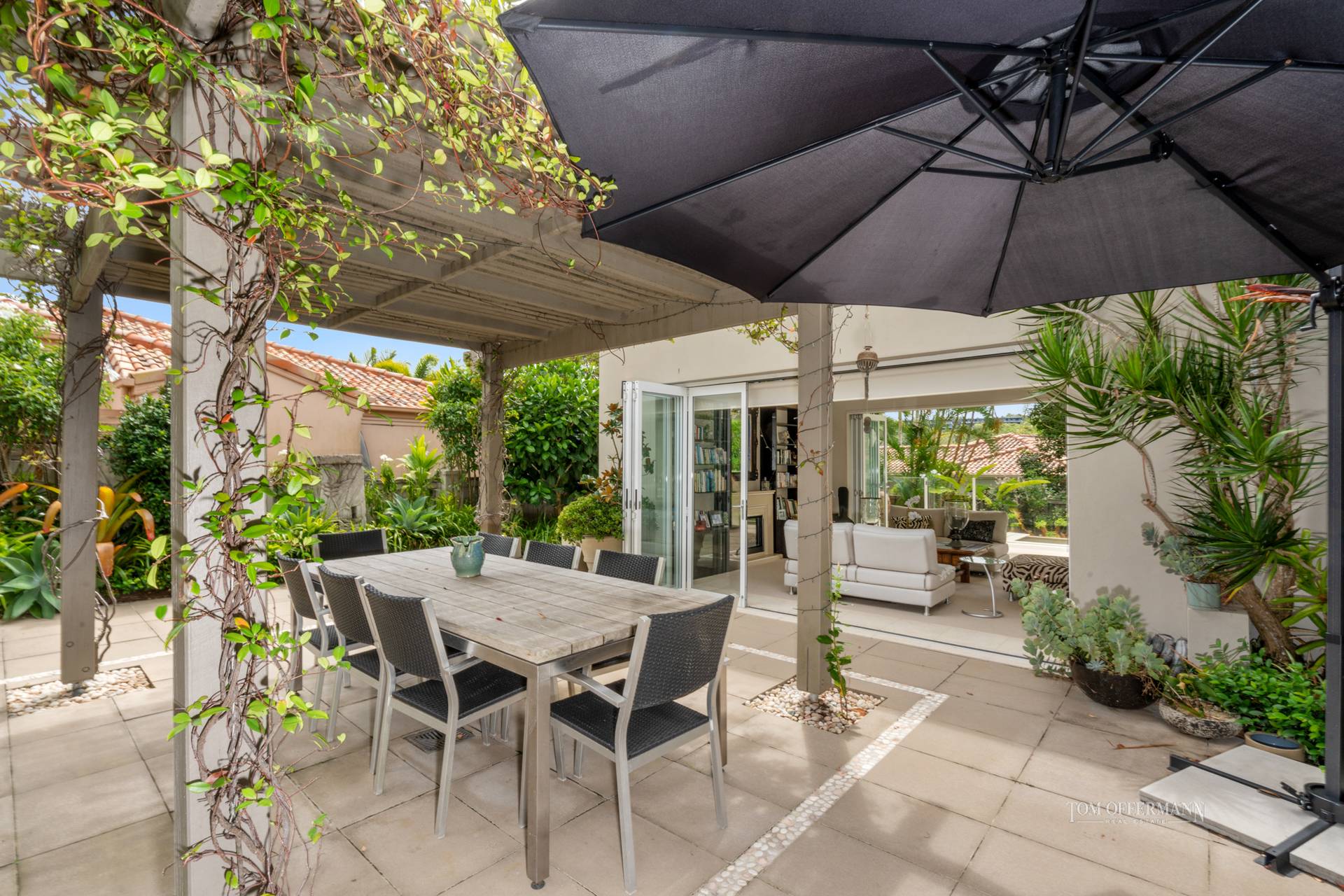 terraces incl poolside; central courtyard w pergola & goldfish-filled