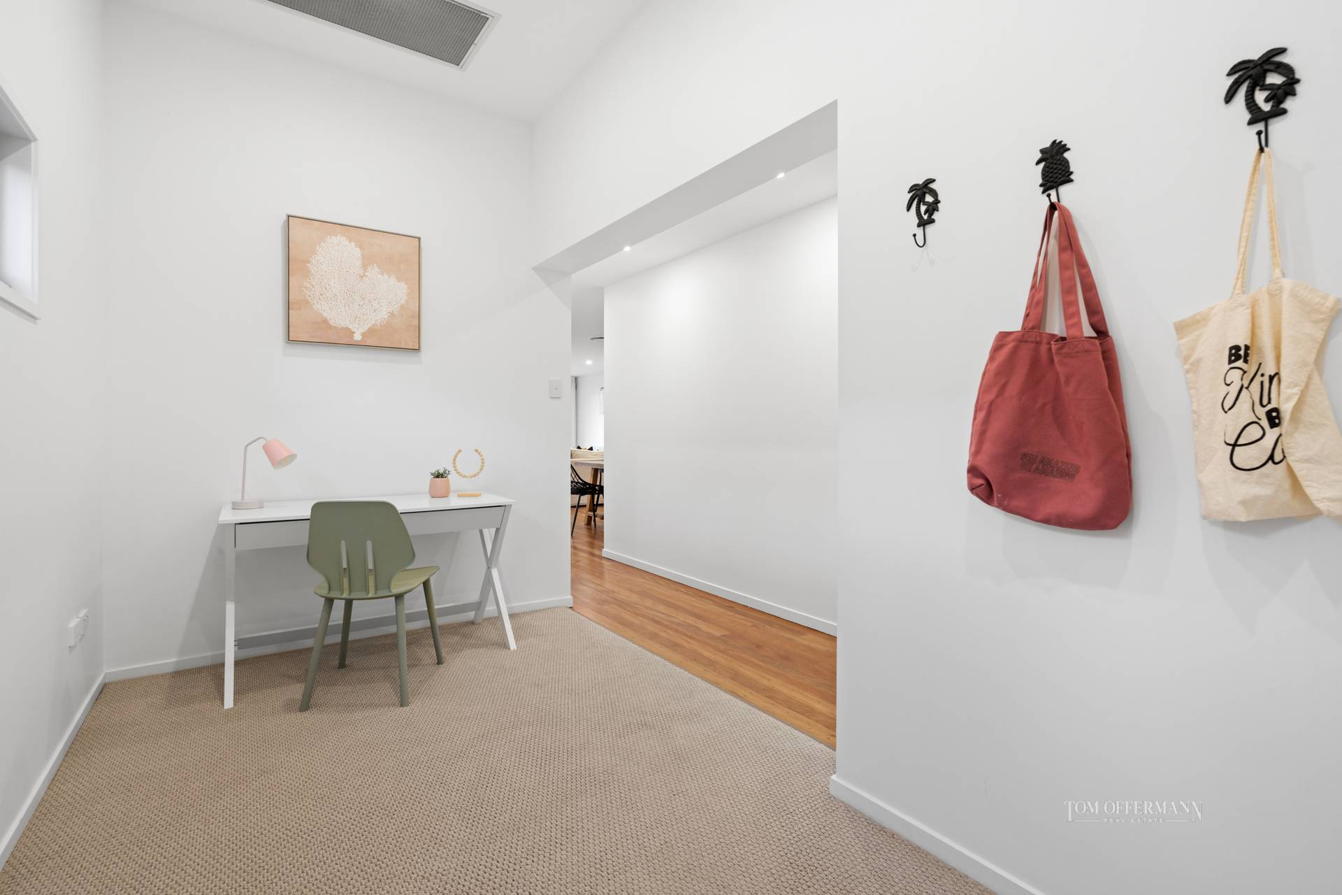 There are four carpeted bedrooms with wispy sheers. On the entry level wake up to waves breaking onshore in the mega master suite with walk-in robe, ensuite with finger wall tiles, lime-washed-look floor tiles and access to the terrace to check on the surf breaks. A queen bedroom on the west side has a built-in robe and ensuite. A study and a powder room are adjacent.