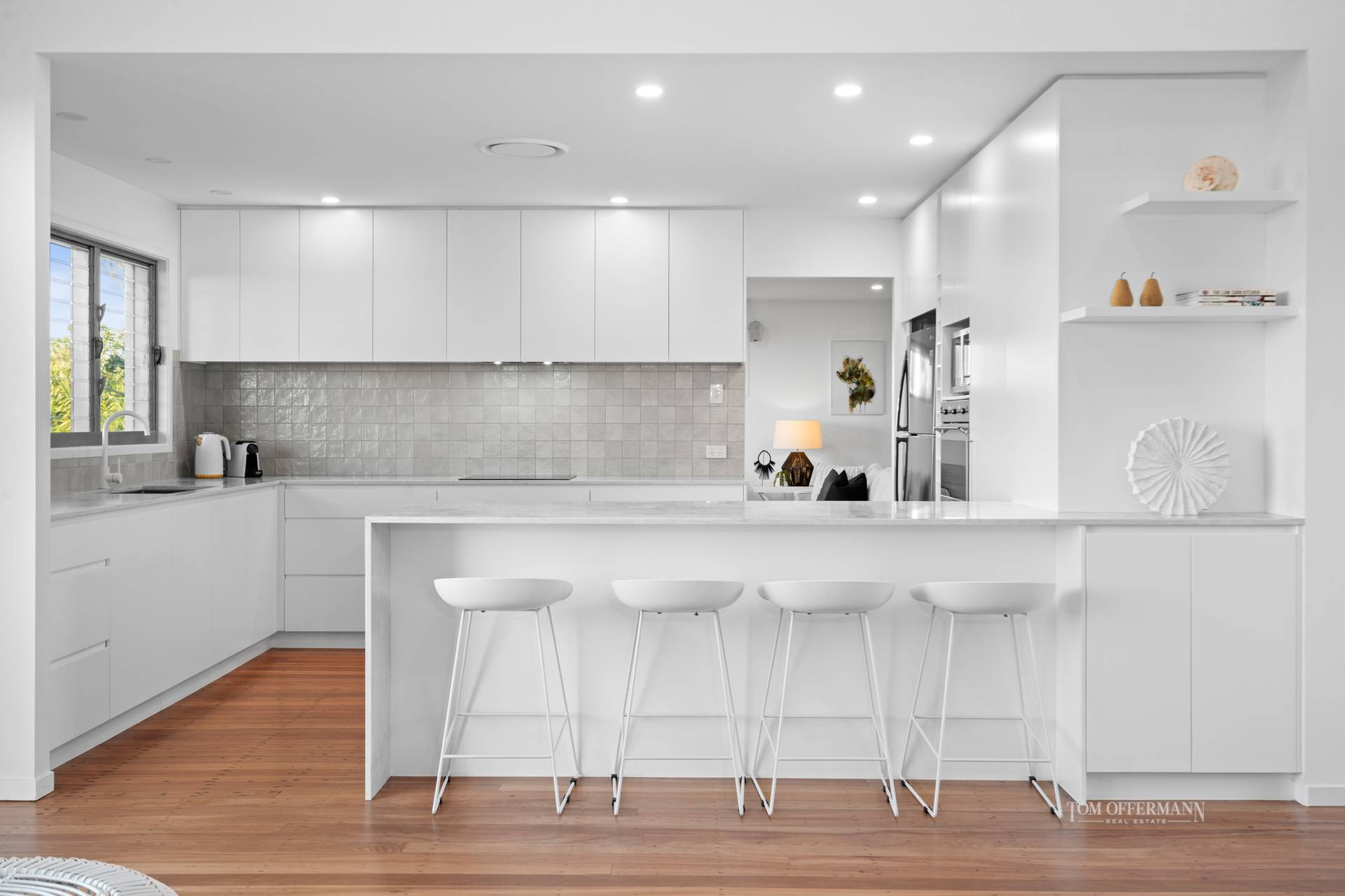 Central to both living spaces is an entertainer's delight, a double L-shaped large kitchen with stone-topped white cabinetry, designer pendants, glass-tiled splashbacks, high-end appliances and walk-in pantry.