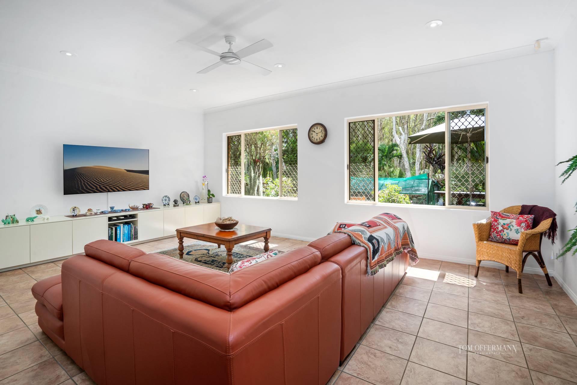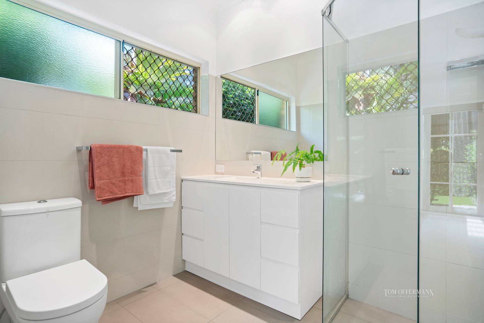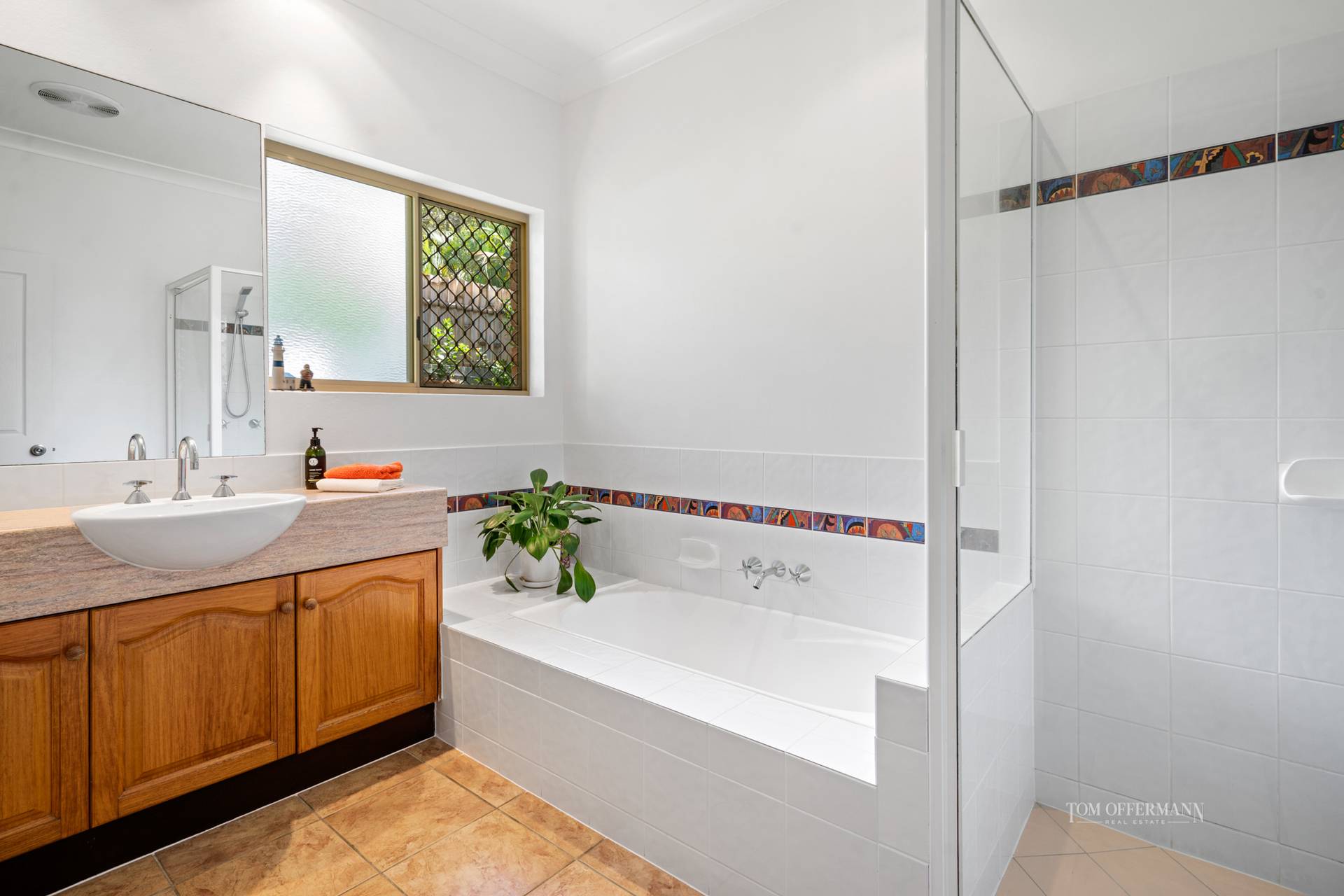Surrounded by nature, dreamtime comes naturally in the four carpeted and sizeable bedrooms with plantation shutters. The master suite/retreat has a walk-in robe, ensuite and opens to the terrace, and three queen-size bedrooms have built-in robes and share a bathroom with timber cabinetry, bathtub and a separate toilet. The laundry is nearby.