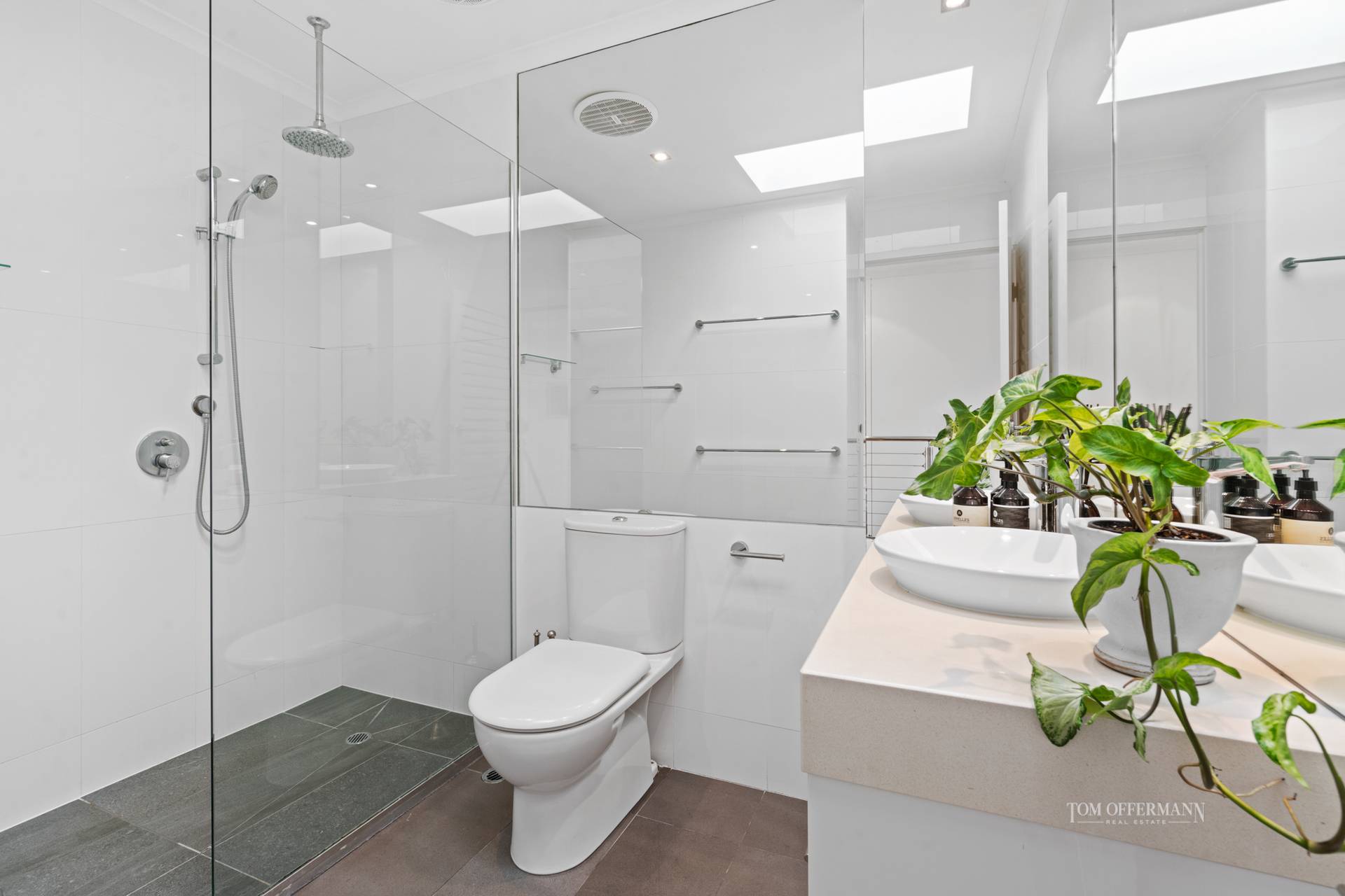 The stairs with timber treads and marine-grade stainless steel balustrading, lead to two carpeted queen-size bedrooms, one of which looks over the swimming pool, the other over the north-facing terrace. Both have plantation shutter-style doors, beautiful wispy linen sheers, block-out blinds, built-in robes and share a modern bathroom.