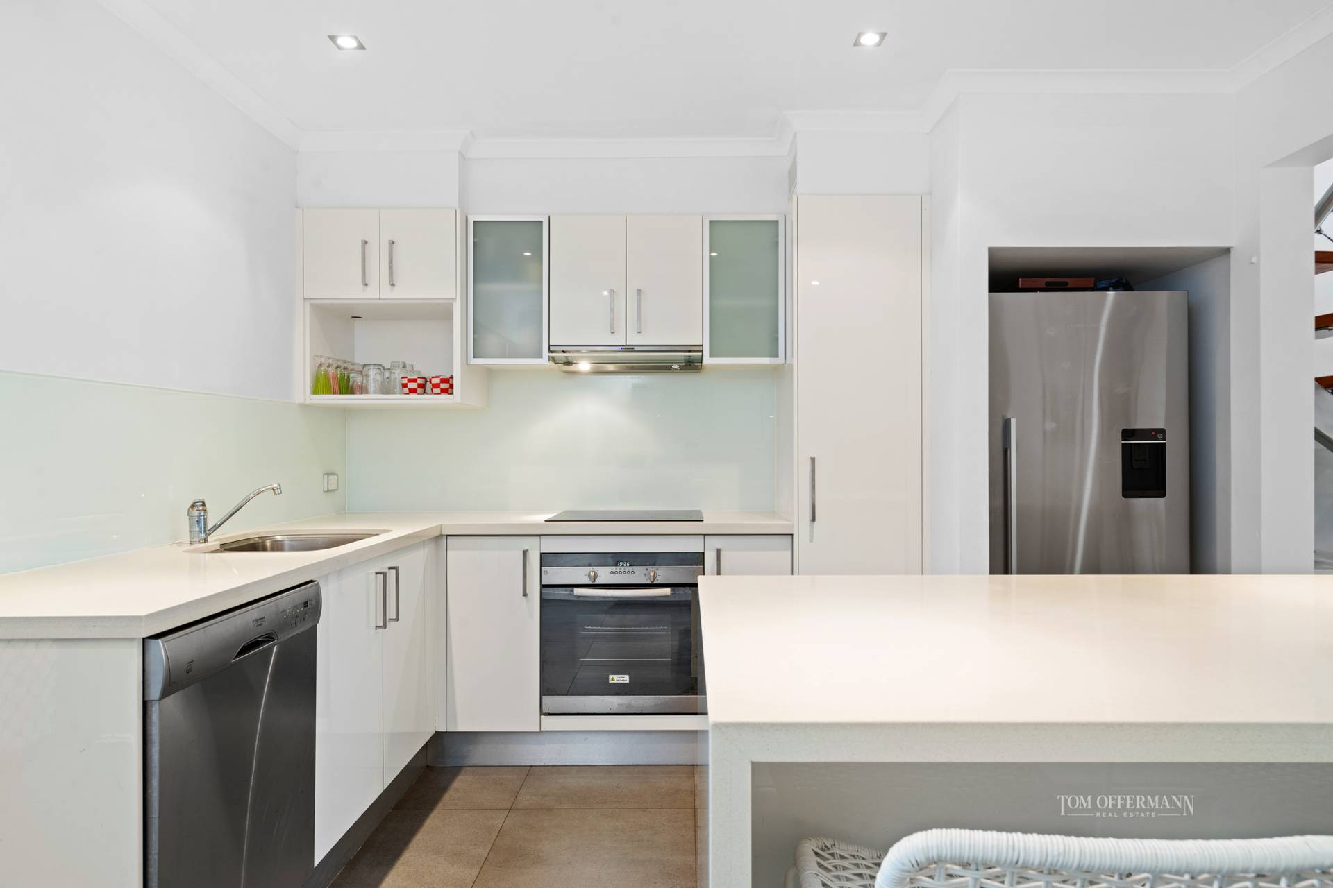 The galley-style kitchen has stone-topped white cabinetry including an island bench/breakfast bar. Drawers are soft close, upper cabinetry has glass fronts, appliances are top shelf, and anyone with a penchant for entertaining will be very happy in the light-filled space thanks to windows and a rear door where there's a herb garden.