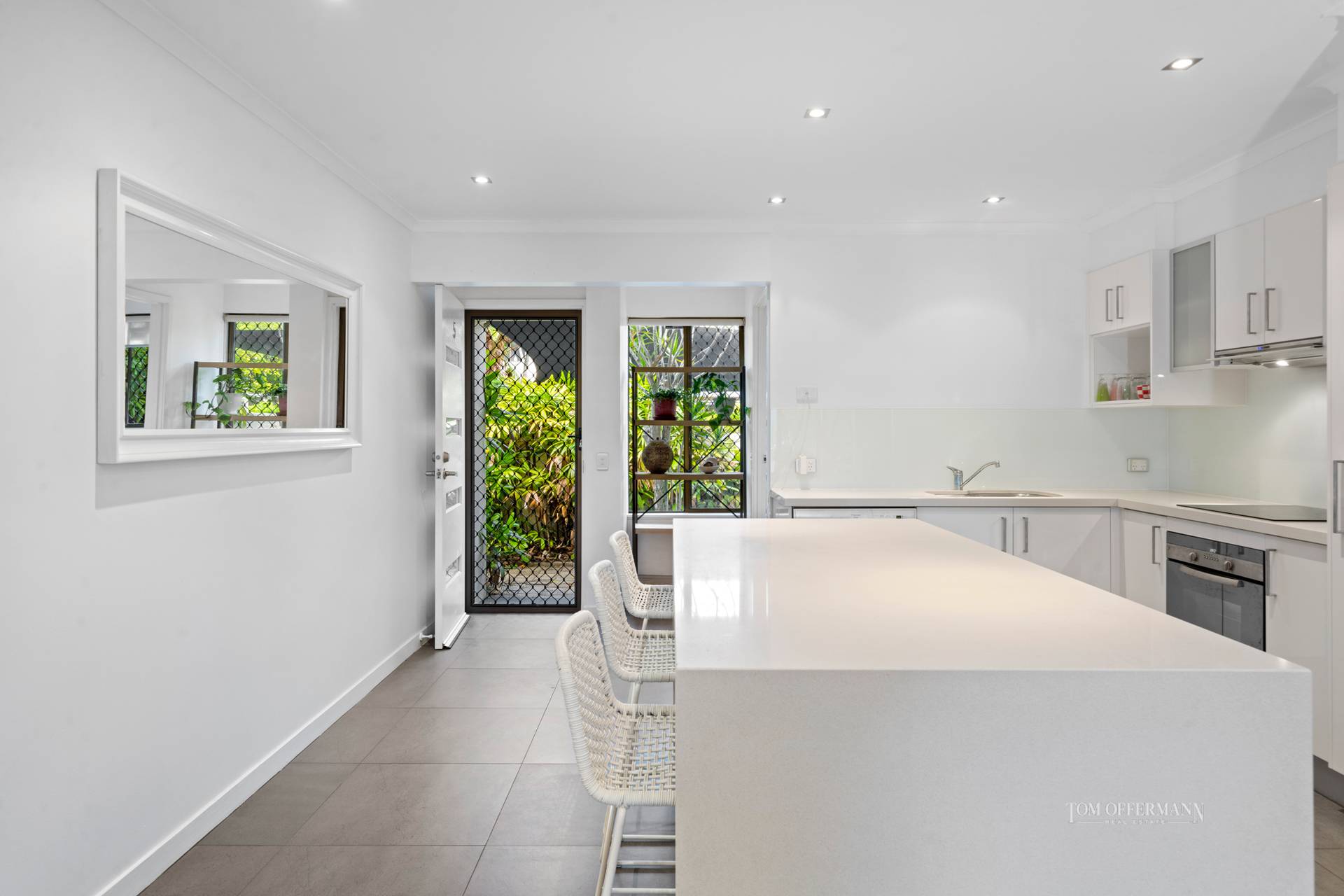 Admire the frangipani near the front gate as it opens to reveal a timber terrace, tall palms and immediately imagine friends enjoying a lively time in this north-facing slice of paradise. Indoors, with instant connectivity to the outdoor space, has a laid-back feel that's intrinsically calming. It has a generous open-plan living, a neutral palette, tiles throughout, and a sandstone feature column.