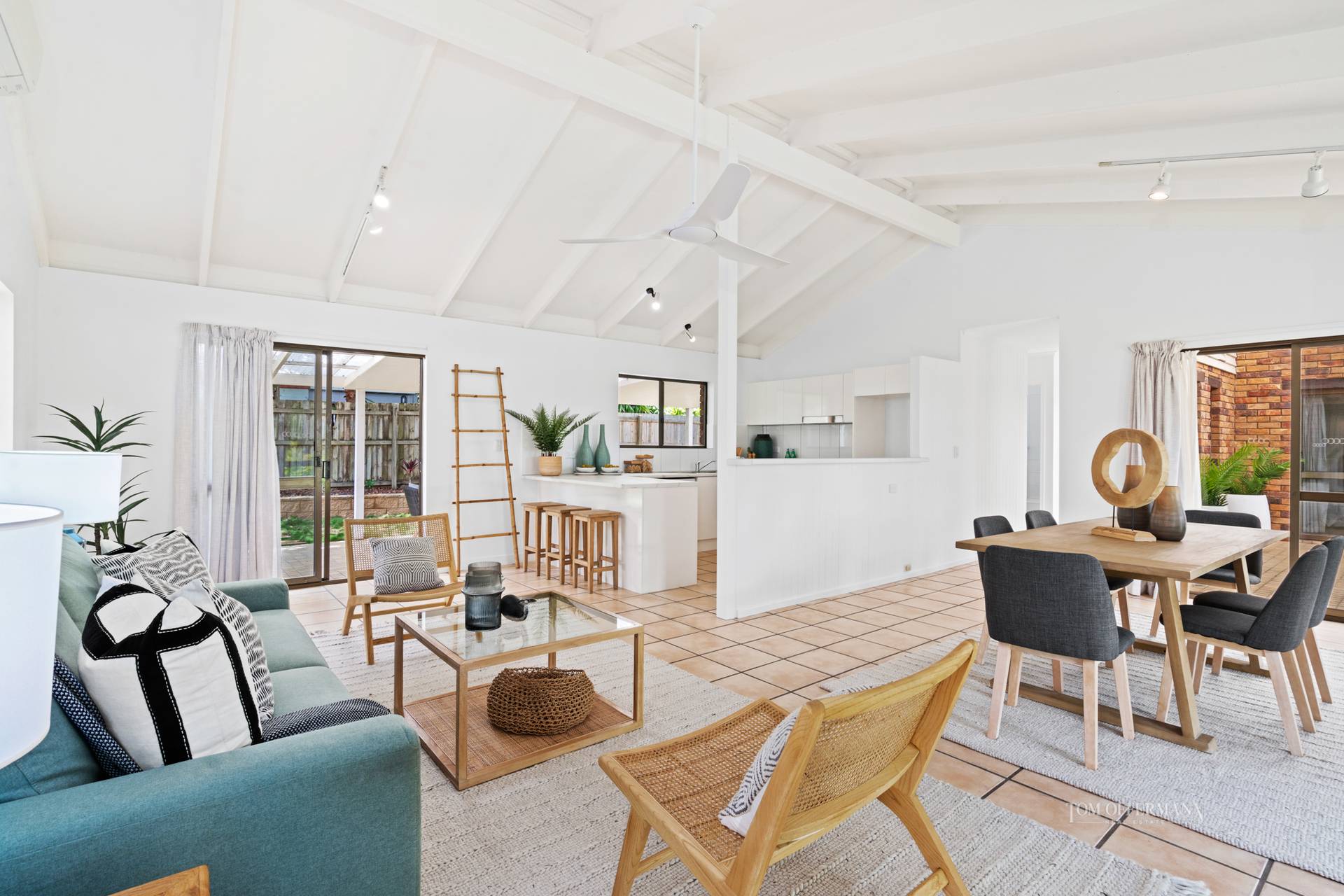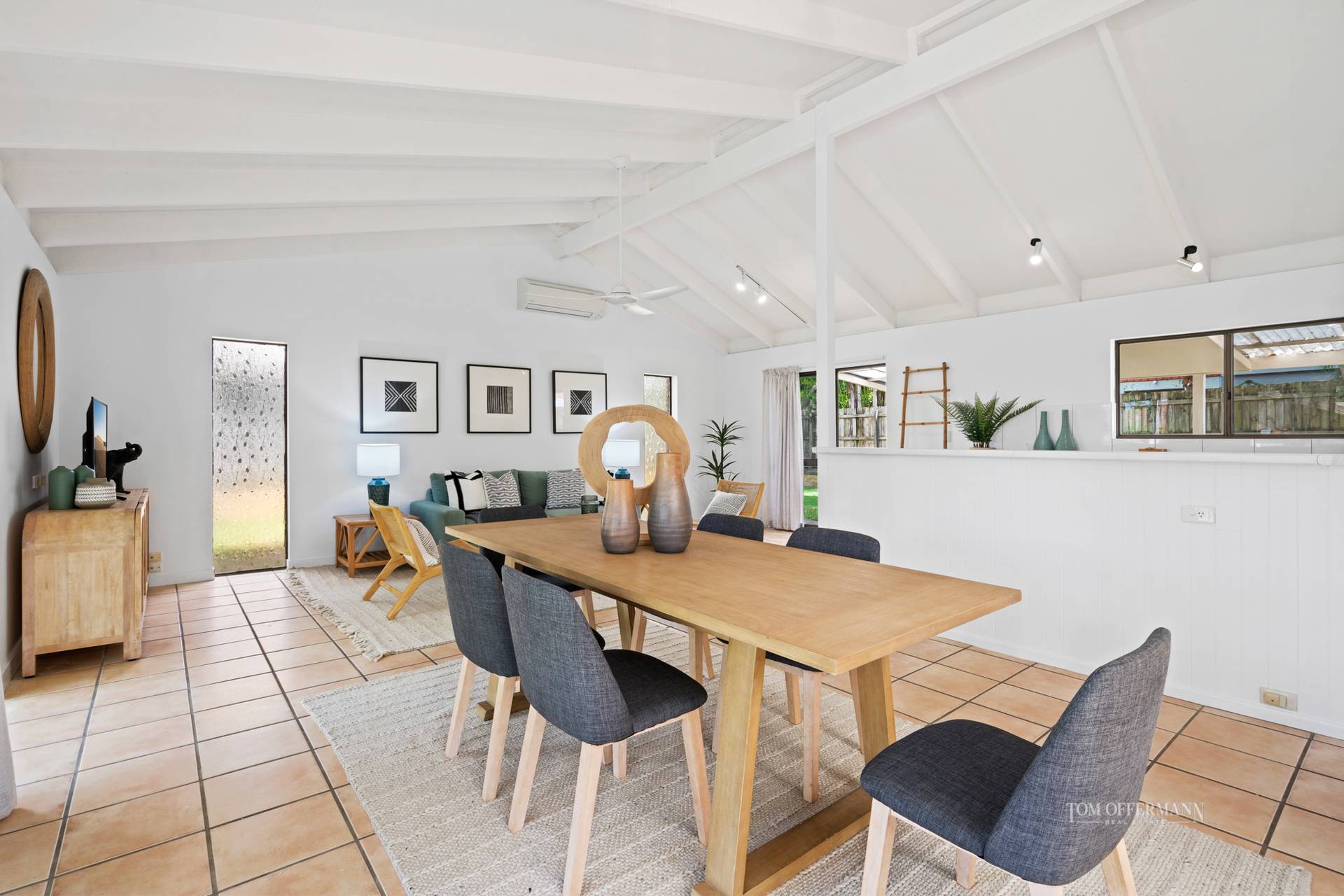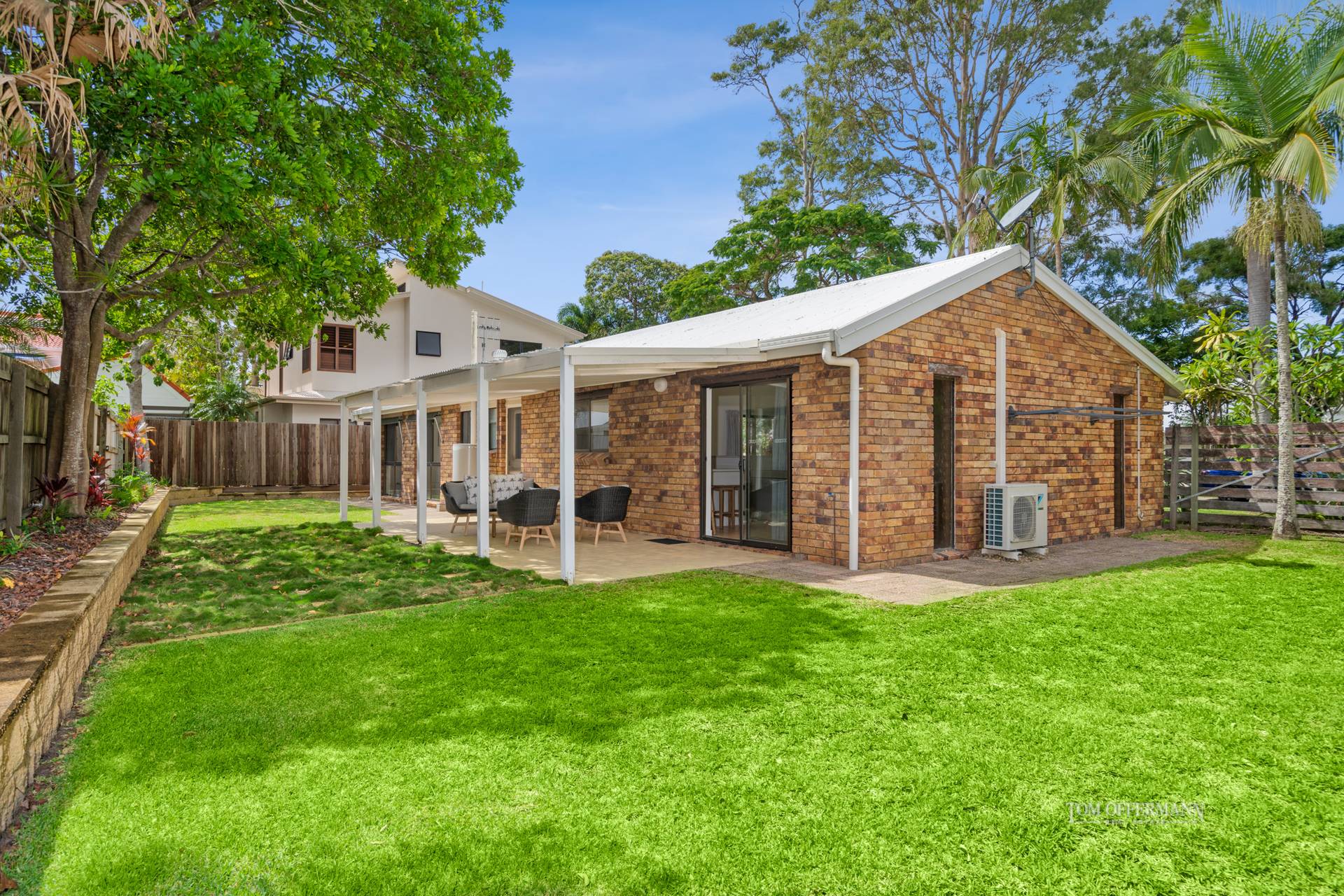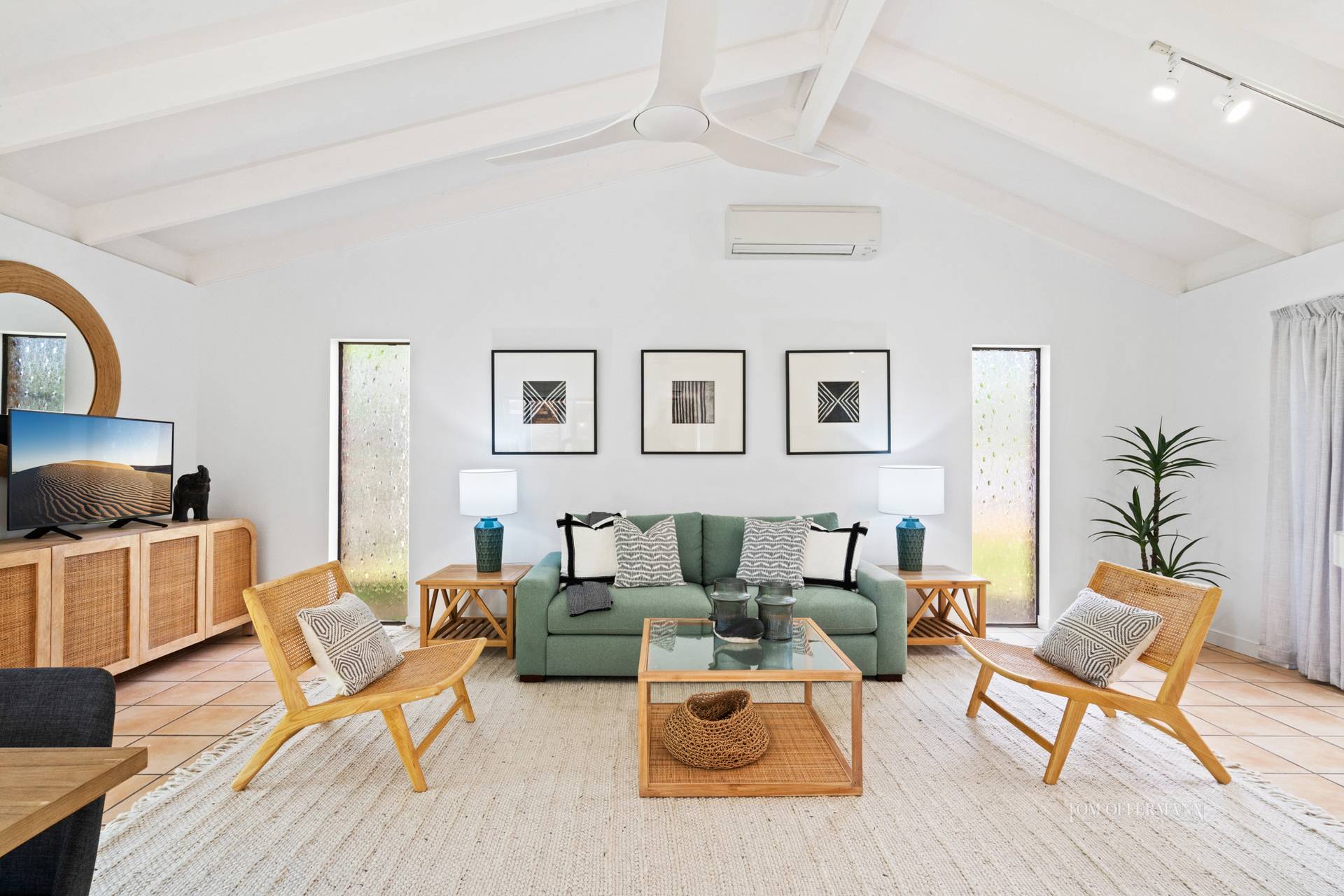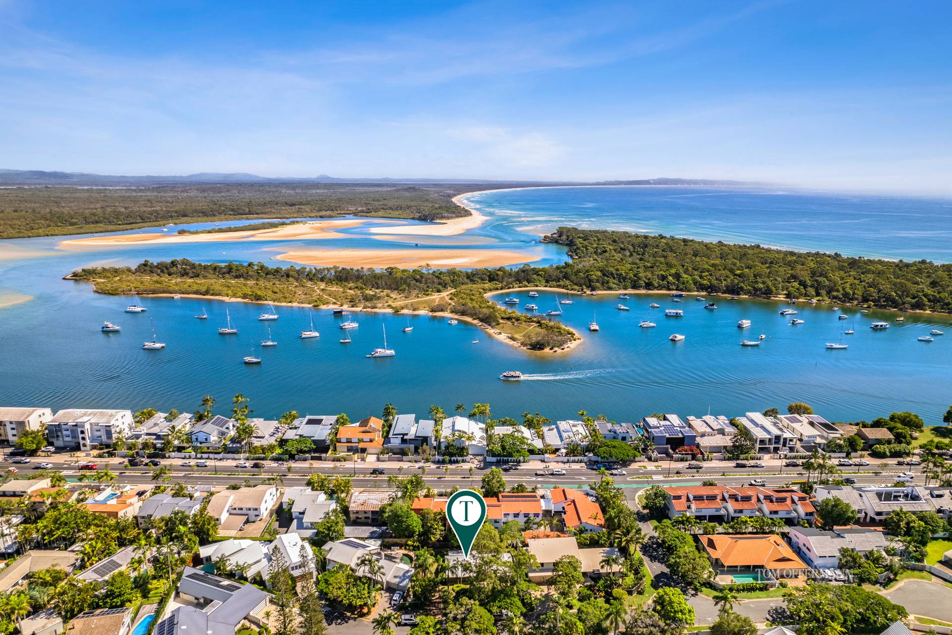 From the leafy cul-de-sac of arguably one of the hottest and most exclusive addresses on Noosa Sound, surrounded by much-admired and sought-after multi-million-dollar contemporary residences, which reflect the relaxed coastal lifestyle implicitly, a brilliant red, wide-arboured Poinciana and stately Bangalow palms, are the centrepiece of the front garden of a charming, and cute 70's cottage.