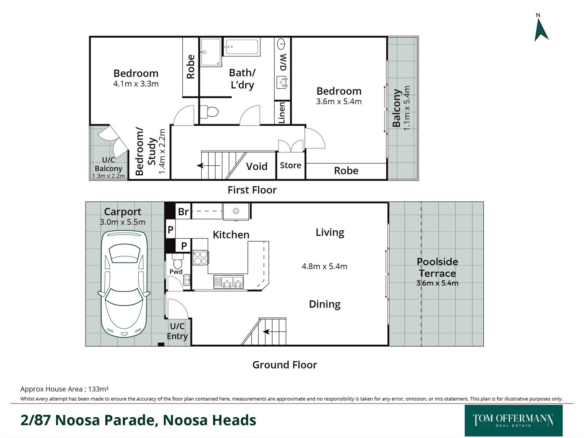 - Townhouse Area: 133m2 incl 3.6m x 5.4m partial undercover poolside terrace
