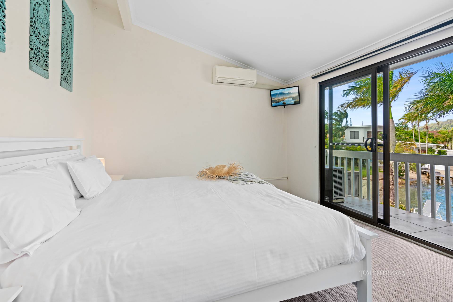 The grey-carpeted stairs with stainless steel balustrading lead to two bedrooms with built-in robes. The king bedroom has a television and a balcony looking over a broader part of the luminous waterway; the queen-size bedroom has the advantage of also having a single bed plus there is a small balcony; and the bathroom/laundry with white tiled mocha cabinetry has a bath and shower plus washing machine and a dryer. There is a powder room downstairs.