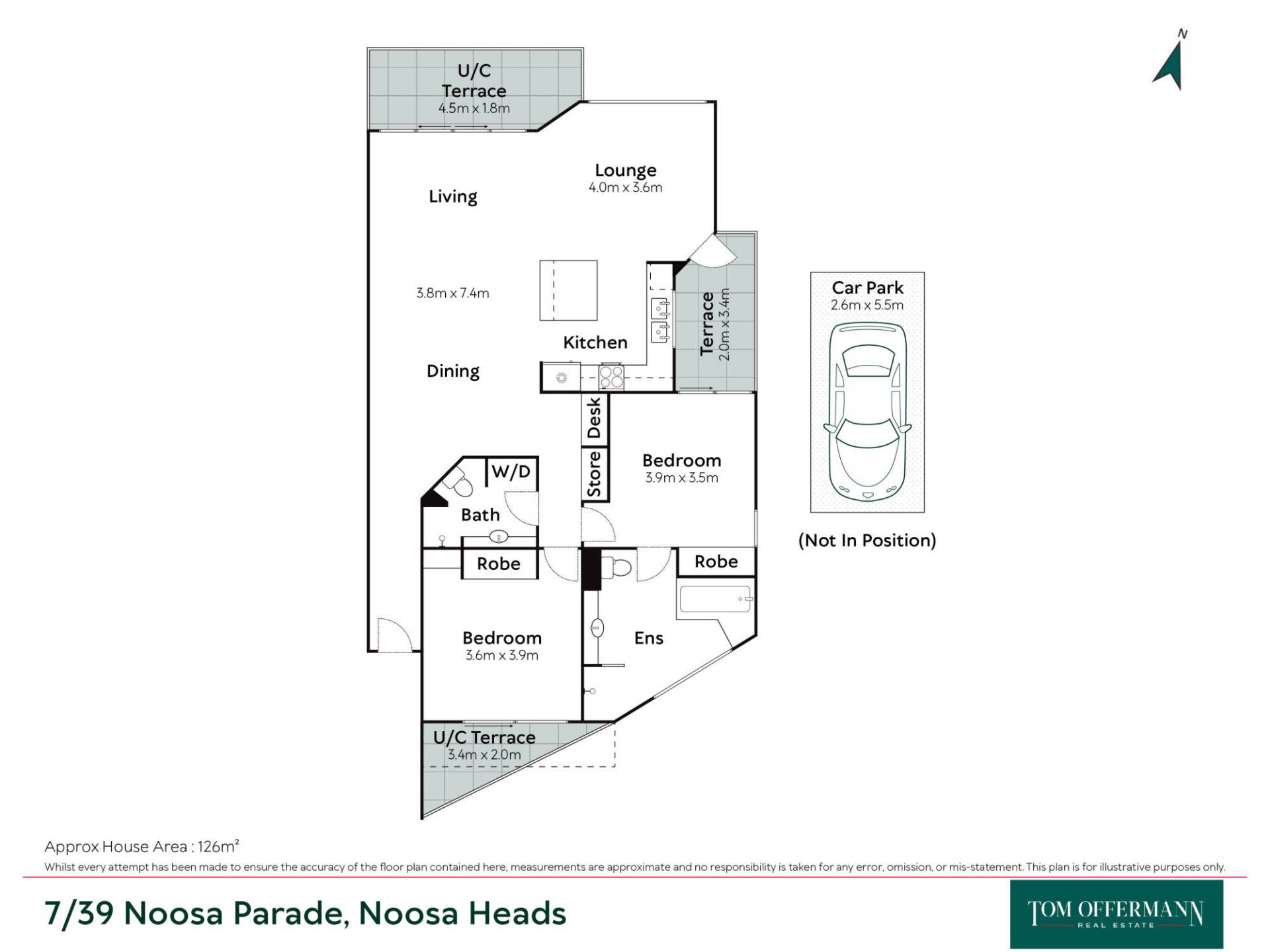 - Terraces: 3 undercover - 4.5m x 1.8 nth facing off living; 2m x 3.4m NE-facing off master; 3.4m x 2m sth-facing off 2nd bedroom