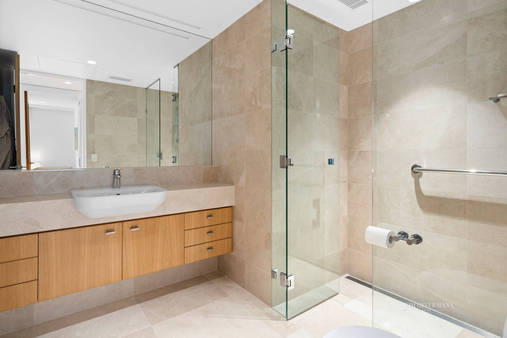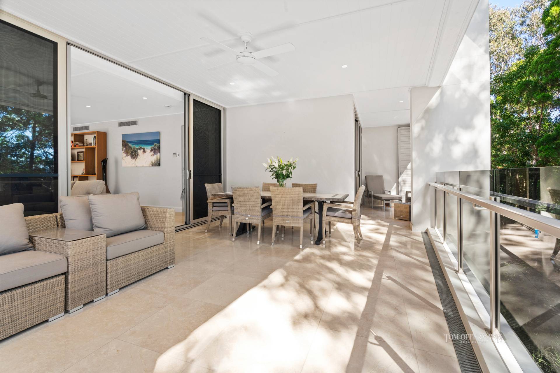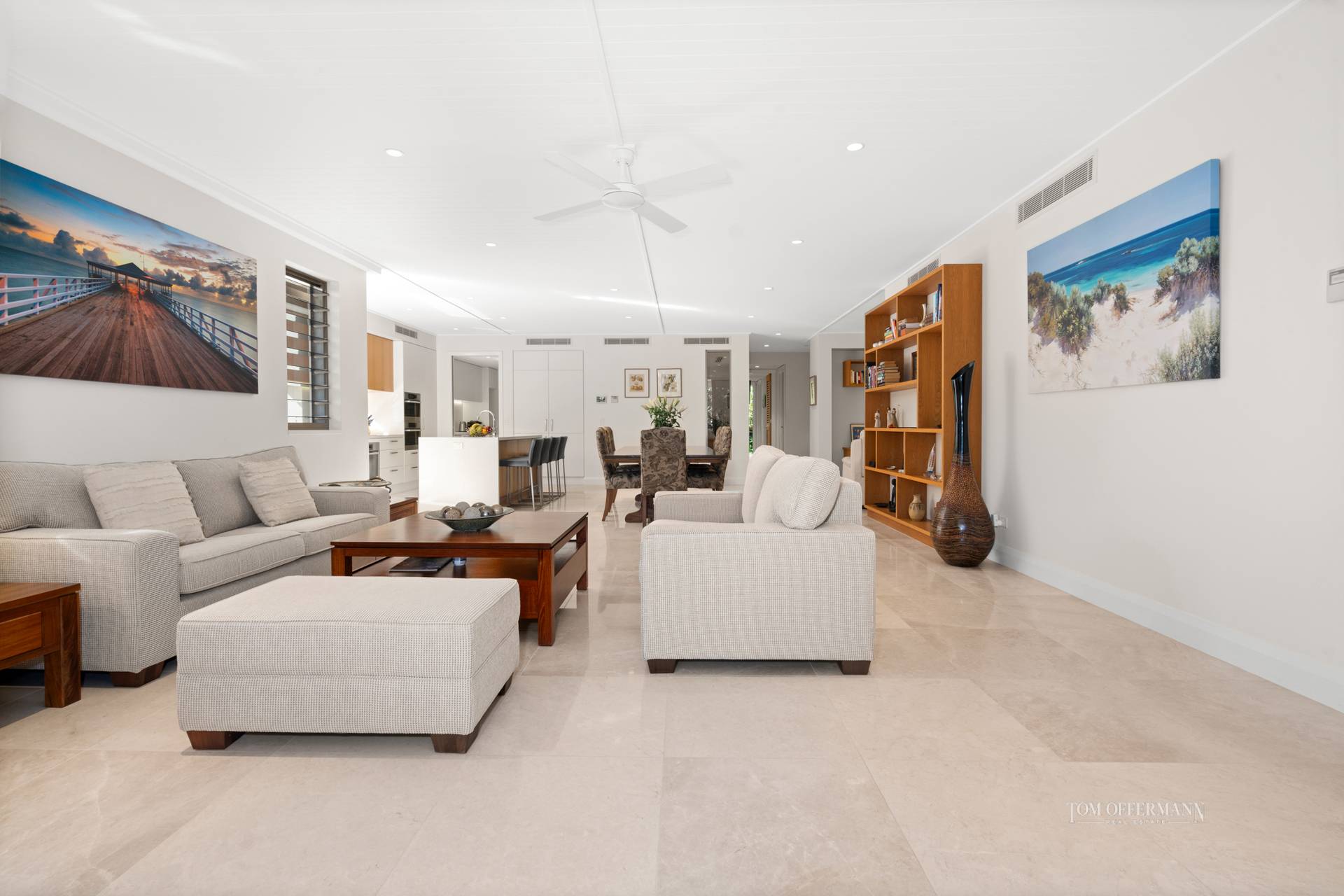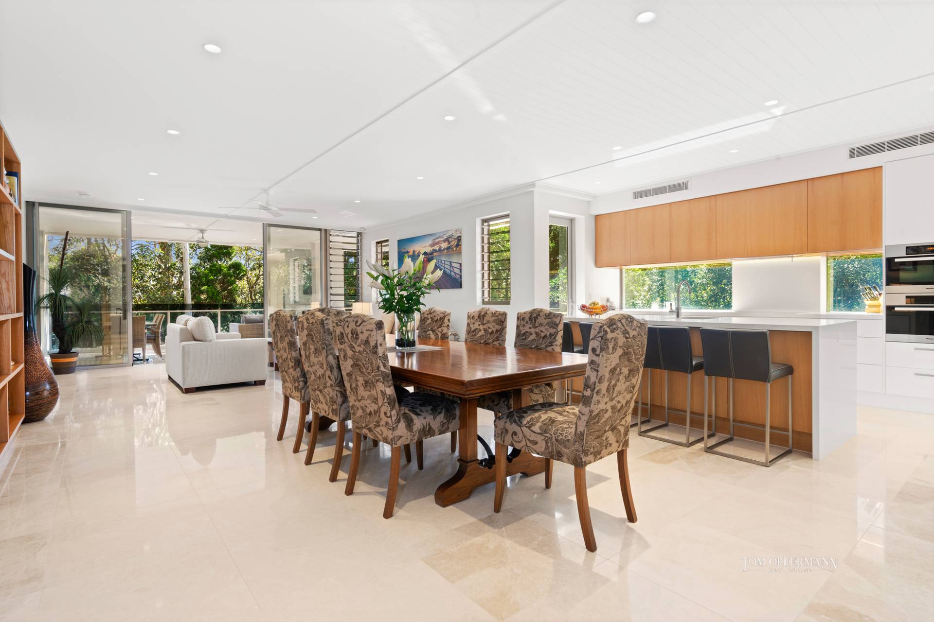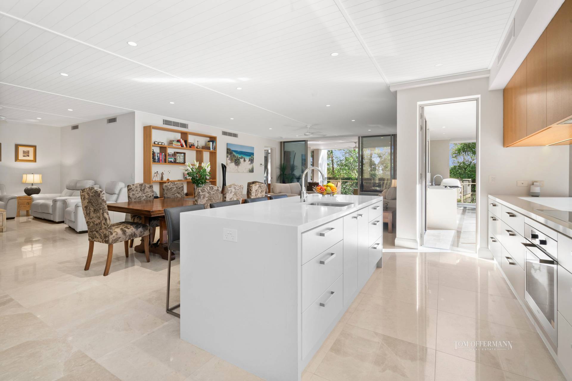 Do come inside. From the entrance foyer, premium quality throughout is obvious. There's a primarily neutral palette with monochromatic accents plus lashings of sheen in the lofty ceilinged prodigious living and dining areas where sunshine shadow dances over the marble floors.