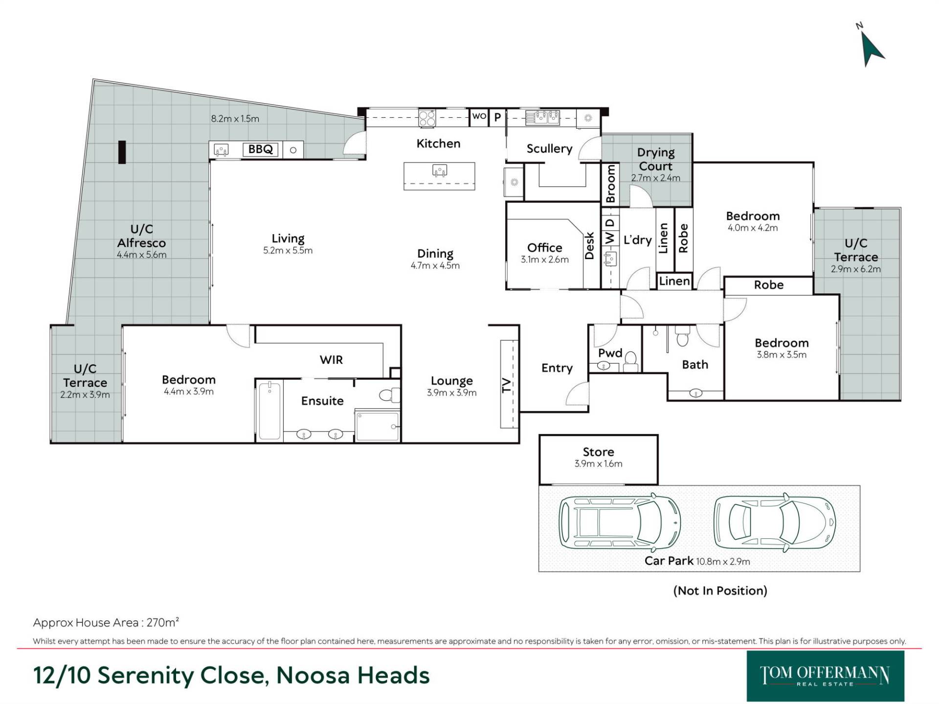 • Terraces: main north east-facing undercover 4.4m x 5.6m off living, adjoins 2.2m x 3.9m off master w stainless steel plantation shutters on east side; also wraps 8.2m x 1.5m on northside w access from kitchen to outdoor kitchen, under-bench storage & BBQ; undercover east side 2.9m x 6.2m off 2 bedrooms