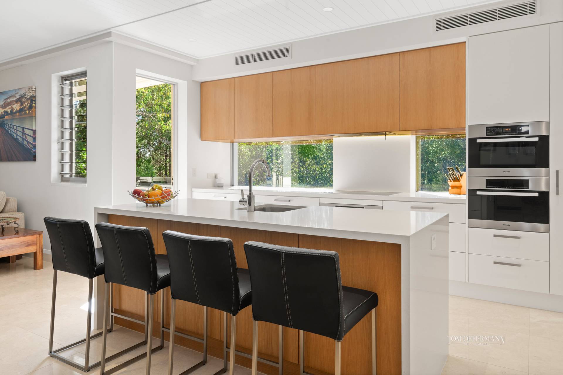 • Kitchen: 2m creamy-white stone island bench/breakfast bar w 2-pac cabinetry & soft close drawers; integrated Miele 4 dr fridge, wine fridge, dishwasher, induction cooktop & dble ovens; butlers pantry w storage aplenty