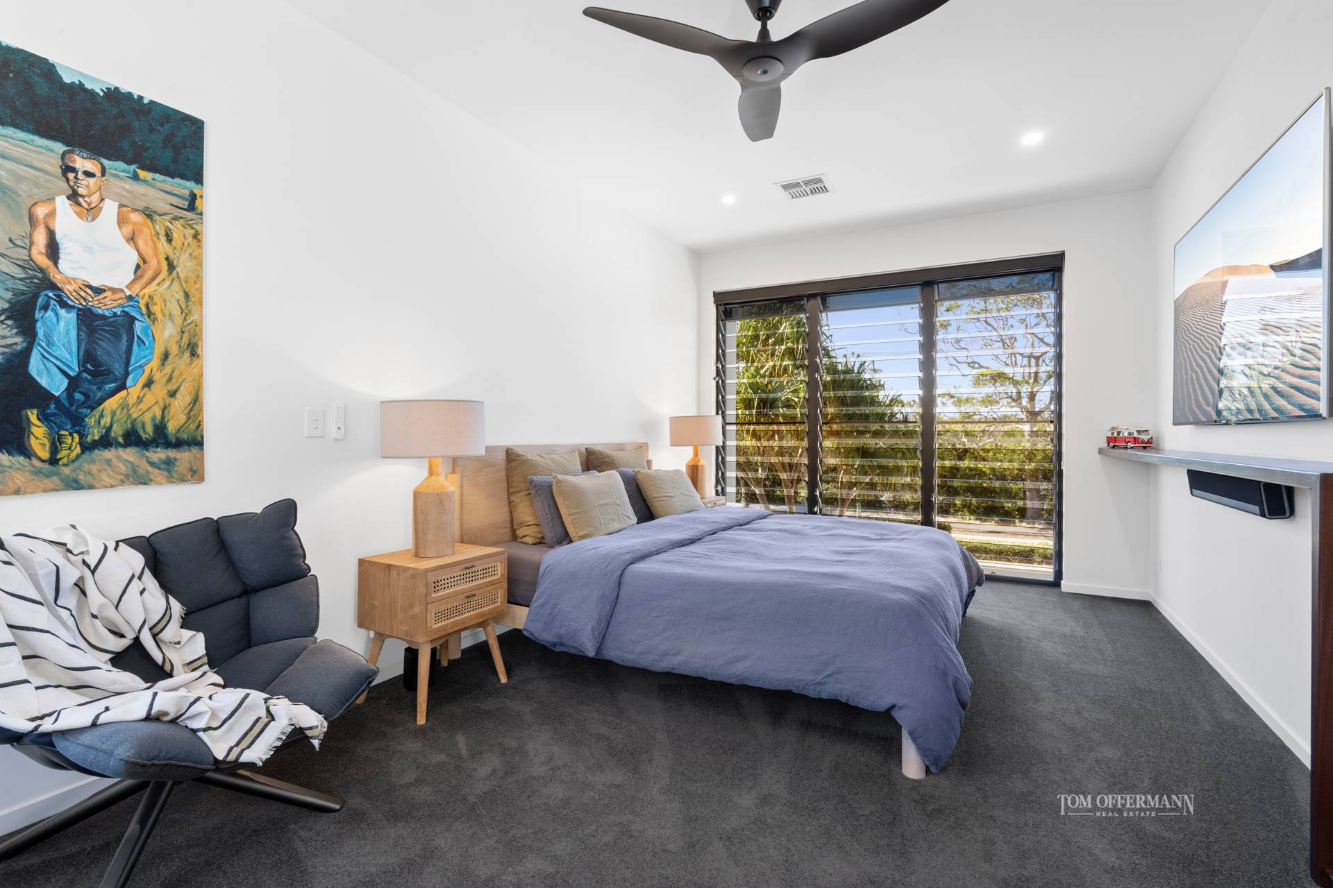 Upstairs, along the suspended gallery-style walkway, is devoted to dreamtime. In the north-east wing, wake to wondrous views of the Weyba waterways in the king suite. There's a walk-in robe and a serious-sized ensuite with two-basin custom cabinetry. In the northwest wing are two queen bedrooms with built-in robes. A bathroom with bathtub, separate toilet and study/media space are close.
