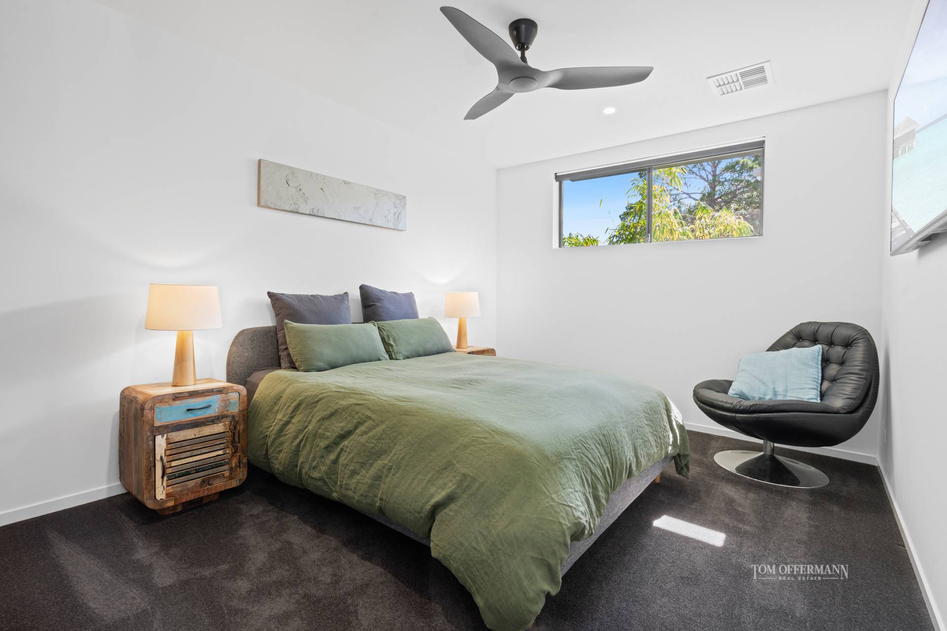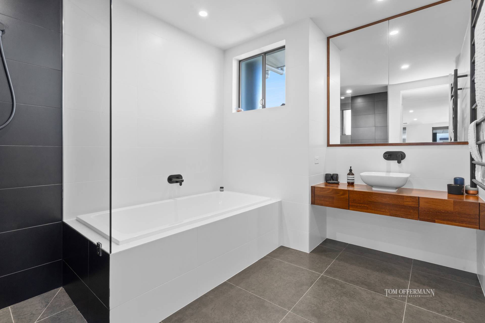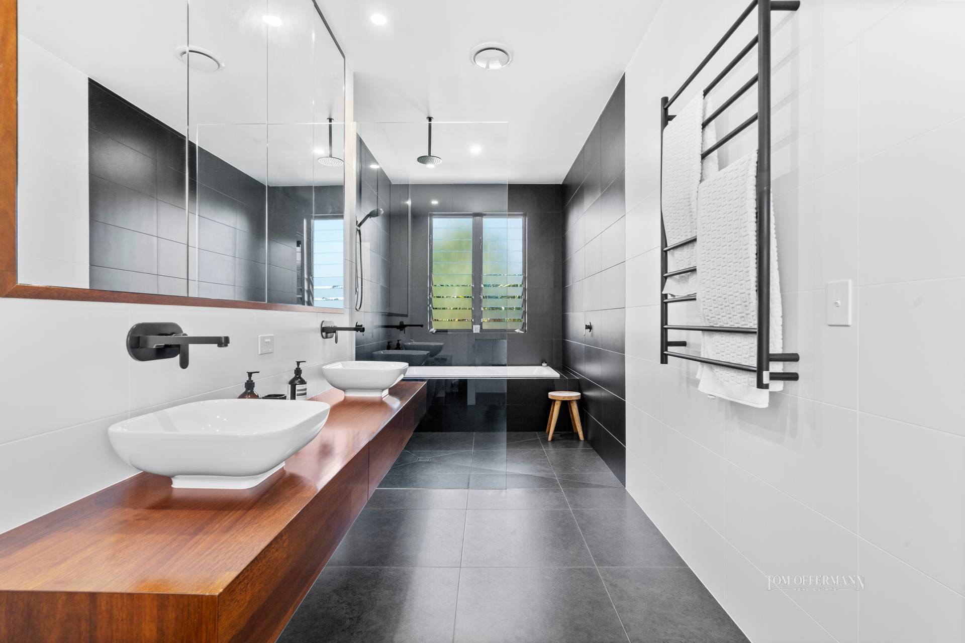 • About: honed concrete floors ground level to alfresco entertainment areas; clever design w abundant natural light, north-facing entertaining living & dining; ceiling heights 3.6m/5.4m void; auto blackout blinds throughout; Sonos sound system; custom cabinetry w melunak & tonka teak timber features; solar hot water; ducted air/fans; extensive storage; 3-bedrooms - NE wing king suite w view over Weyba waterways, walk-in robe & bathroom; NW wing w 2 queen bedrooms, bathroom, bath, sep toilet and study/media space close; bathrooms w recessed cabinets/power outlets, heated towel rails, floor to ceiling tiles, frameless shower screens & wall hung timber cabinetry