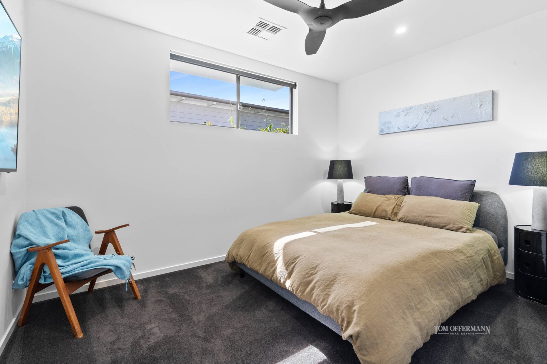 Clever features contributing to the effective moody and mellow design aesthetic, include the use of light-hued melunak timber and tonka teak hardwood. Similarly, the custom L-shaped kitchen with stone-topped cabinetry including island/breakfast bar with waterfall edge, soft-close drawers, walk-in pantry, Miele premium appliances and on-trend black tapware. Everything for the consummate entertainer and culinary wizard is here.