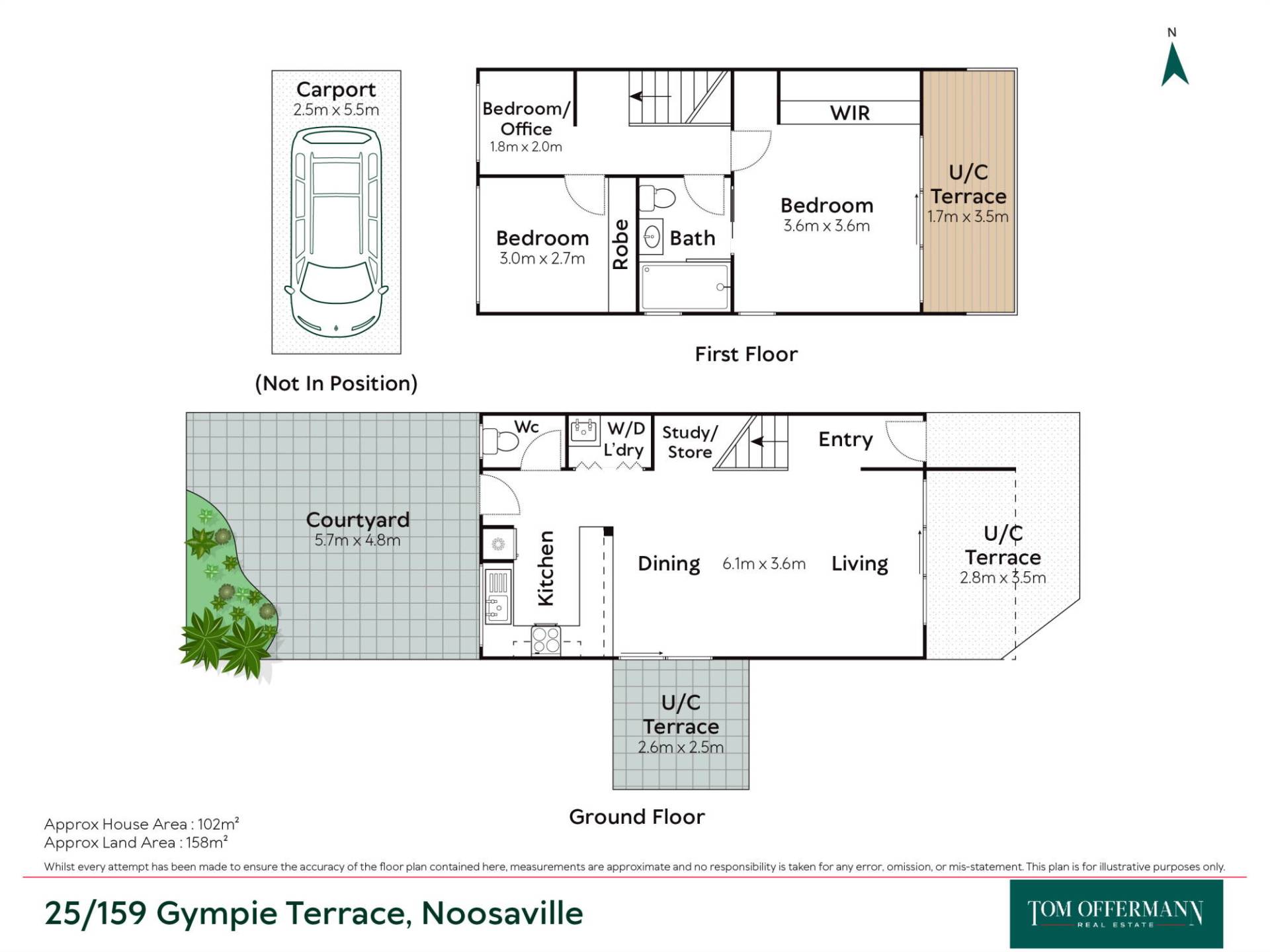 Upstairs are three carpeted bedrooms. Two are queen-size; the main has a walk-in robe and undercover terrace with northerly views. The second has a built-in robe; the third is a single; and all share a two-way bathroom. There is a powder room downstairs.